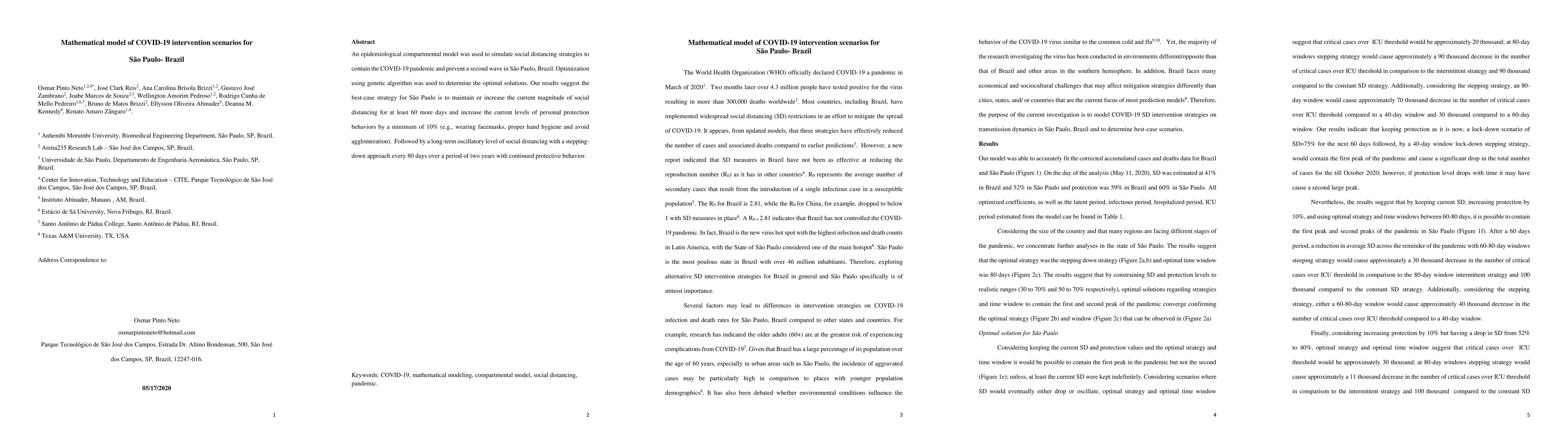 An epidemiological compartmental model was used to simulate social distancing strategies to contain the COVID-19 pandemic and prevent a second wave in Sao Paulo, Brazil. Optimization using genetic algorithm was used to determine the optimal solutions. Our results suggest the best-case strategy for Sao Paulo is to maintain or increase the current magnitude of social distancing for at least 60 more days and increase the current levels of personal protection behaviors by a minimum of 10% (e.g., wearing facemasks, proper hand hygiene and avoid agglomeration). Followed by a long-term oscillatory level of social distancing with a stepping-down approach every 80 days over a period of two years with continued protective behavior.