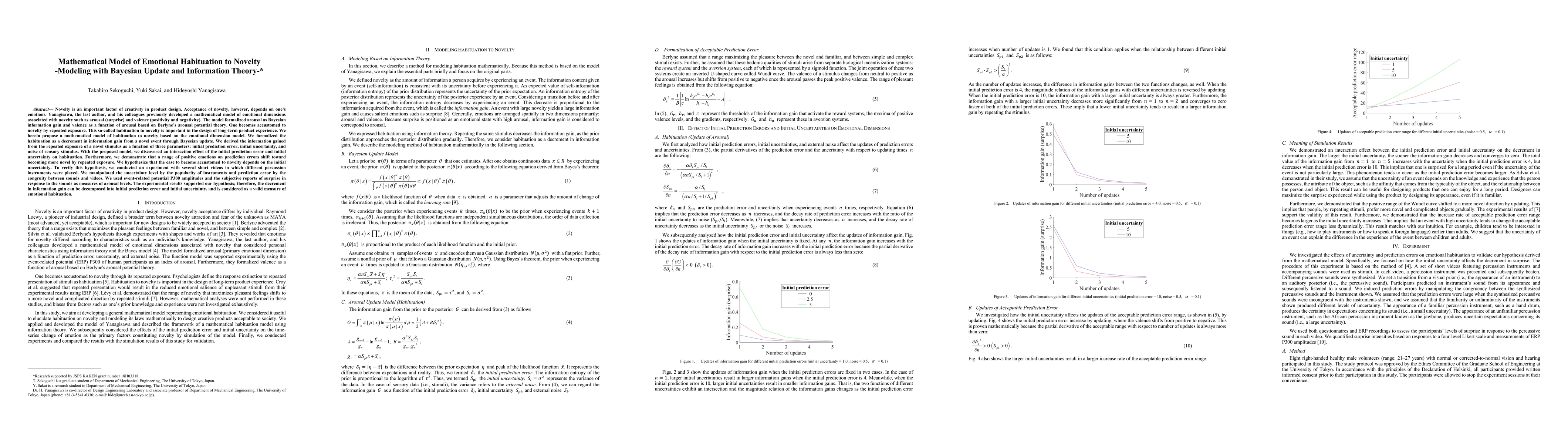 Novelty is an important factor of creativity in product design. Acceptance of novelty, however, depends on one's emotions. Yanagisawa, the last author, and his colleagues previously developed a mathematical model of emotional dimensions associated with novelty such as arousal (surprise) and valence. The model formalized arousal as Bayesian information gain and valence as a function of arousal based on Berlyne's arousal potential theory. One becomes accustomed to novelty by repeated exposure. This so-called habituation to novelty is important in the design of long-term product experience. We herein propose a mathematical model of habituation to novelty based on the emotional dimension model. We formalized the habituation as a decrement in information gain from a novel event through Bayesian update. We derived the information gained from the repeated exposure of a novel stimulus as a function of three parameters: initial prediction error, initial uncertainty, and noise of sensory stimulus. With the proposed model, we discovered an interaction effect of the initial prediction error and initial uncertainty on habituation. Furthermore, we demonstrate that a range of positive emotions on prediction errors shift toward becoming more novel by repeated exposure.