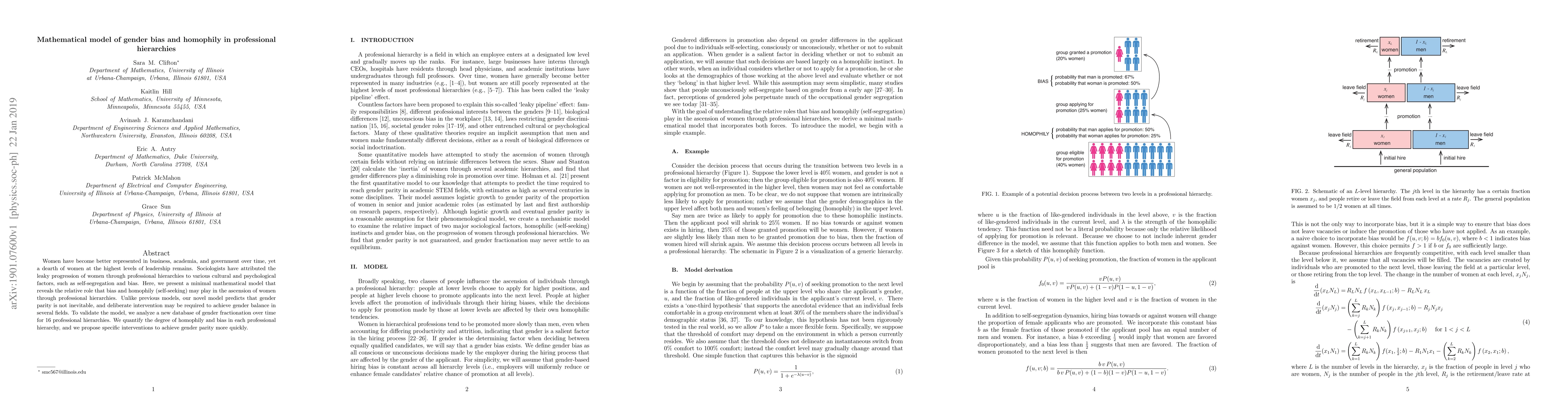 This paper develops a mathematical model to analyze gender bias and homophily in professional hierarchies, showing that gender parity is not guaranteed without intervention. The model is validated using a new database of gender fractionation across 16 professional hierarchies, and it proposes targeted interventions to accelerate gender balance.