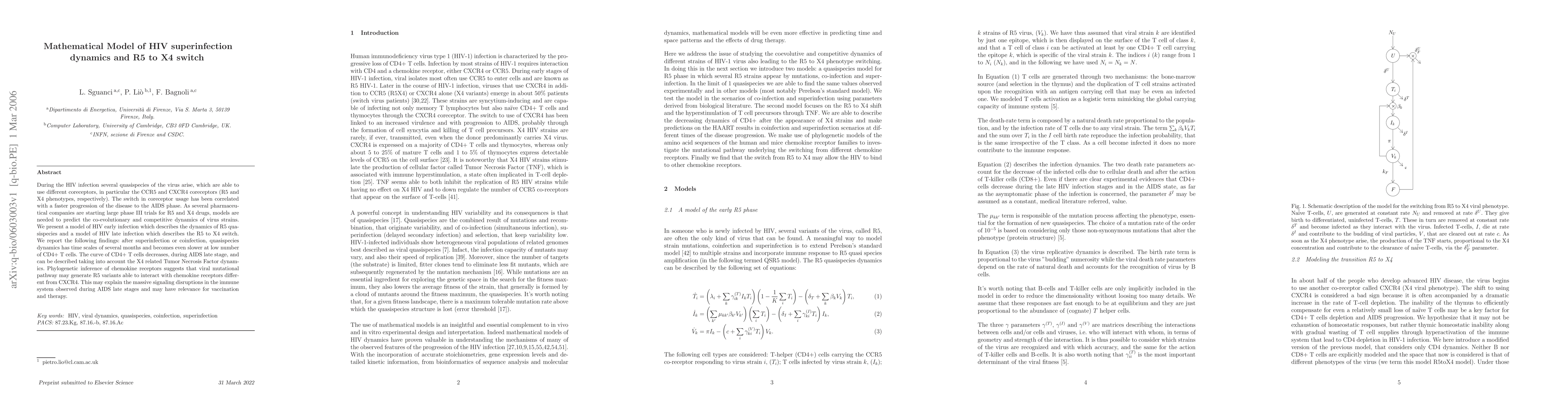 This study models HIV superinfection dynamics and the R5 to X4 switch in coreceptor usage, finding that quasispecies evolution occurs over several months and that the viral mutational pathway may generate new variants able to interact with different chemokine receptors.