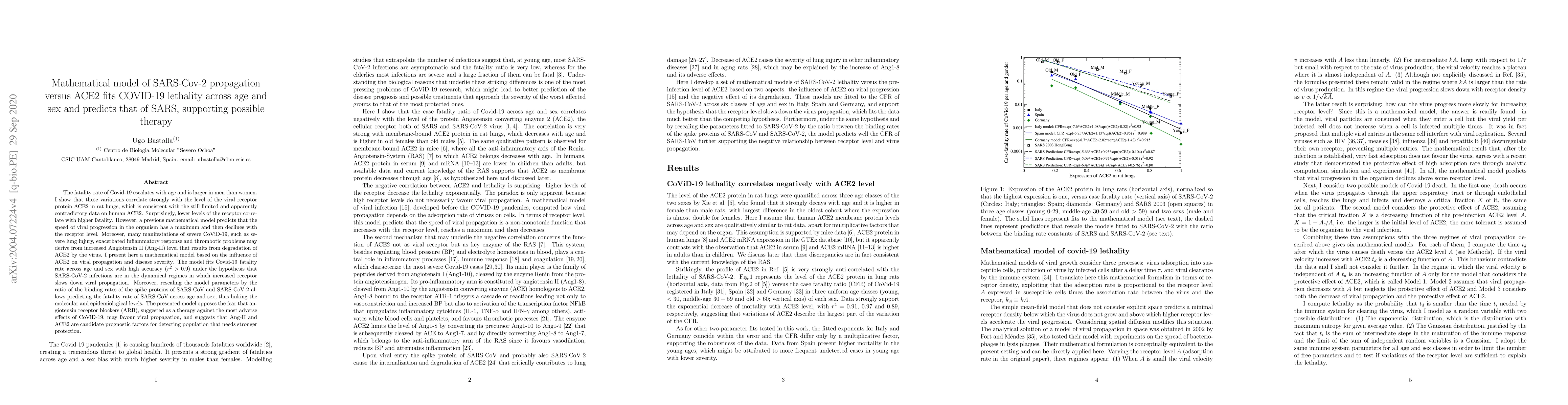 The fatality rate of Covid-19 escalates with age and is larger in men than women. I show that these variations correlate strongly with the level of the viral receptor protein ACE2 in rat lungs, which is consistent with the still limited and apparently contradictory data on human ACE2. Surprisingly, lower levels of the receptor correlate with higher fatality. However, a previous mathematical model predicts that the speed of viral progression in the organism has a maximum and then declines with the receptor level. Moreover, many manifestations of severe CoViD-19, such as severe lung injury, exacerbated inflammatory response and thrombotic problems may derive from increased Angiotensin II (Ang-II) level that results from degradation of ACE2 by the virus. I present here a mathematical model based on the influence of ACE2 on viral propagation and disease severity. The model fits Covid-19 fatality rate across age and sex with high accuracy ($r^2>0.9$) under the hypothesis that SARS-CoV-2 infections are in the dynamical regimes in which increased receptor slows down viral propagation. Moreover, rescaling the model parameters by the ratio of the binding rates of the spike proteins of SARS-CoV and SARS-CoV-2 allows predicting the fatality rate of SARS-CoV across age and sex, thus linking the molecular and epidemiological levels. The presented model opposes the fear that angiotensin receptor blockers (ARB), suggested as a therapy against the most adverse effects of CoViD-19, may favour viral propagation, and suggests that Ang-II and ACE2 are candidate prognostic factors for detecting population that needs stronger protection.