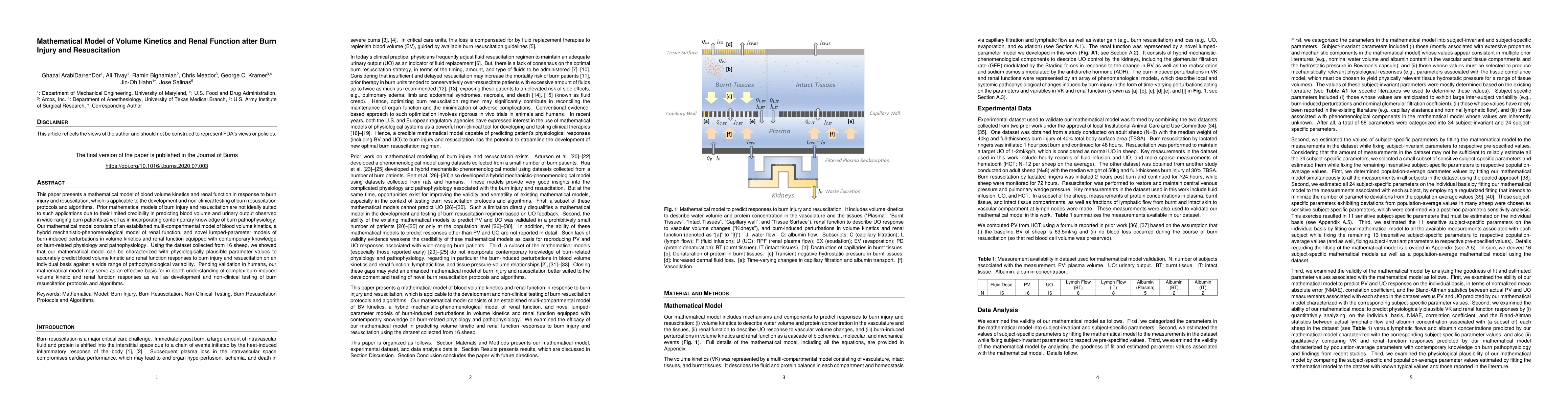 This study presents a mathematical model that accurately predicts blood volume and renal function responses to burn injury and resuscitation in sheep, offering potential for development of personalized burn resuscitation protocols and algorithms.