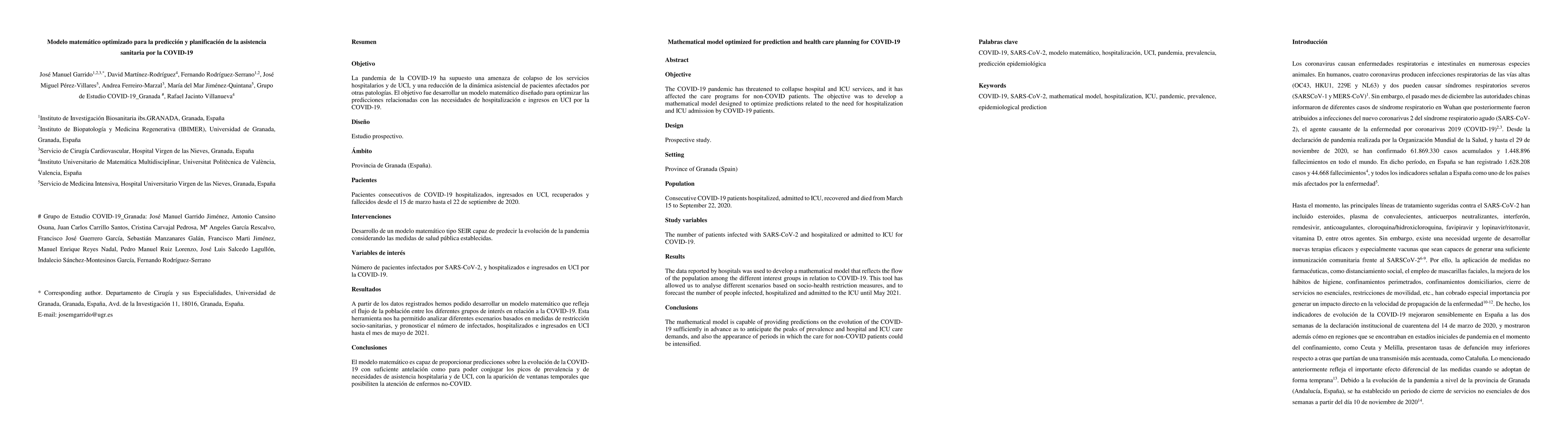 Objective. The COVID-19 pandemic has threatened to collapse hospital and ICU services, and it has affected the care programs for non-COVID patients. The objective was to develop a mathematical model designed to optimize predictions related to the need for hospitalization and ICU admission by COVID-19 patients. Design. Prospective study. Setting. Province of Granada (Spain). Population. Consecutive COVID-19 patients hospitalized, admitted to ICU, recovered and died from March 15 to September 22, 2020. Study variables. The number of patients infected with SARS-CoV-2 and hospitalized or admitted to ICU for COVID-19. Results. The data reported by hospitals was used to develop a mathematical model that reflects the flow of the population among the different interest groups in relation to COVID-19. This tool has allowed us to analyse different scenarios based on socio-health restriction measures, and to forecast the number of people infected, hospitalized and admitted to the ICU until May 2021. Conclusions. The mathematical model is capable of providing predictions on the evolution of the COVID-19 sufficiently in advance as to anticipate the peaks of prevalence and hospital and ICU care demands, and also the appearance of periods in which the care for non-COVID patients could be intensified.
