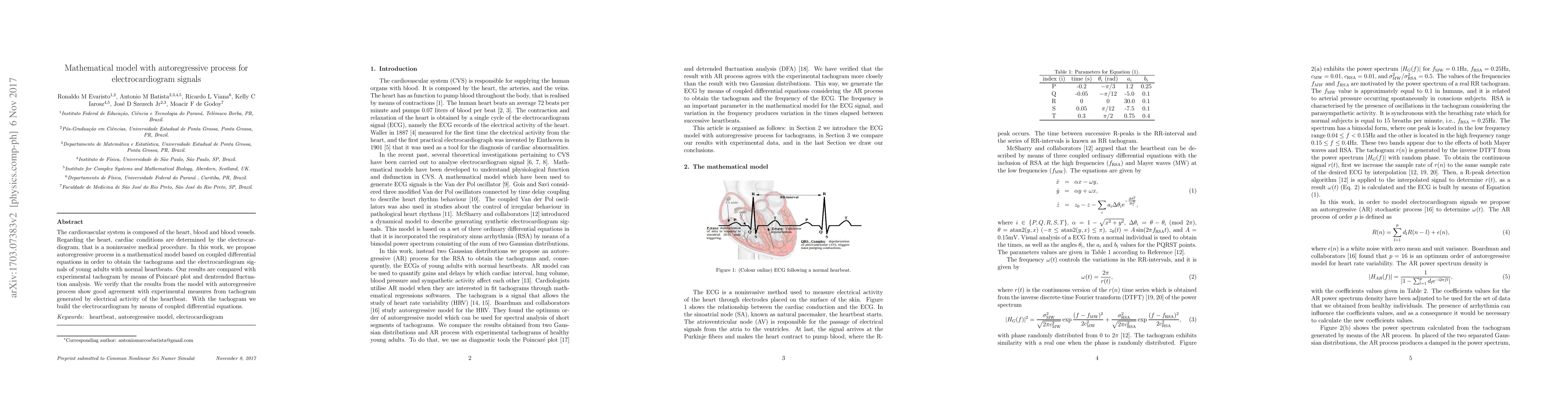 This paper proposes a mathematical model using an autoregressive process based on coupled differential equations to model electrocardiogram signals. The model's accuracy is validated through comparison with experimental tachogram data using Poincar\'e plot and dentrended fluctuation analysis, showing good agreement.