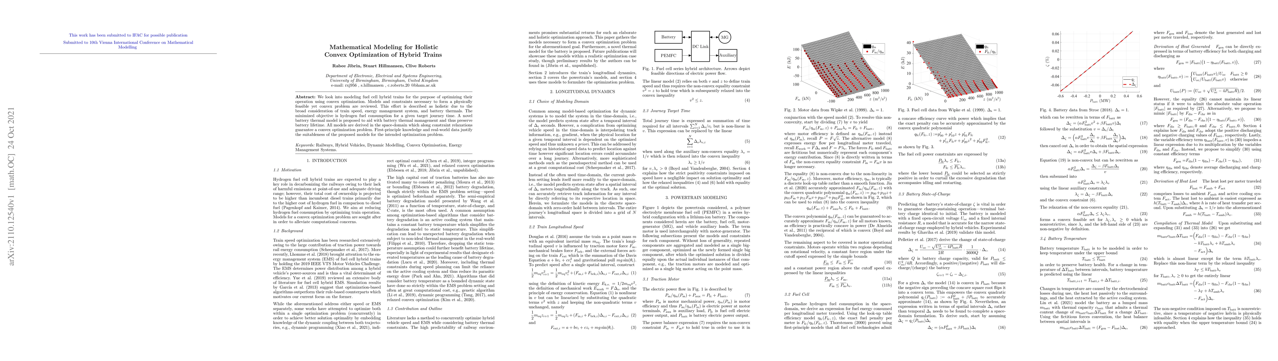 This paper develops a mathematical model for optimizing the operation of hybrid trains using convex optimization, focusing on minimizing hydrogen fuel consumption while considering train speed, energy management, and battery thermals. A novel battery thermal model is introduced to enhance thermal management and extend battery life.