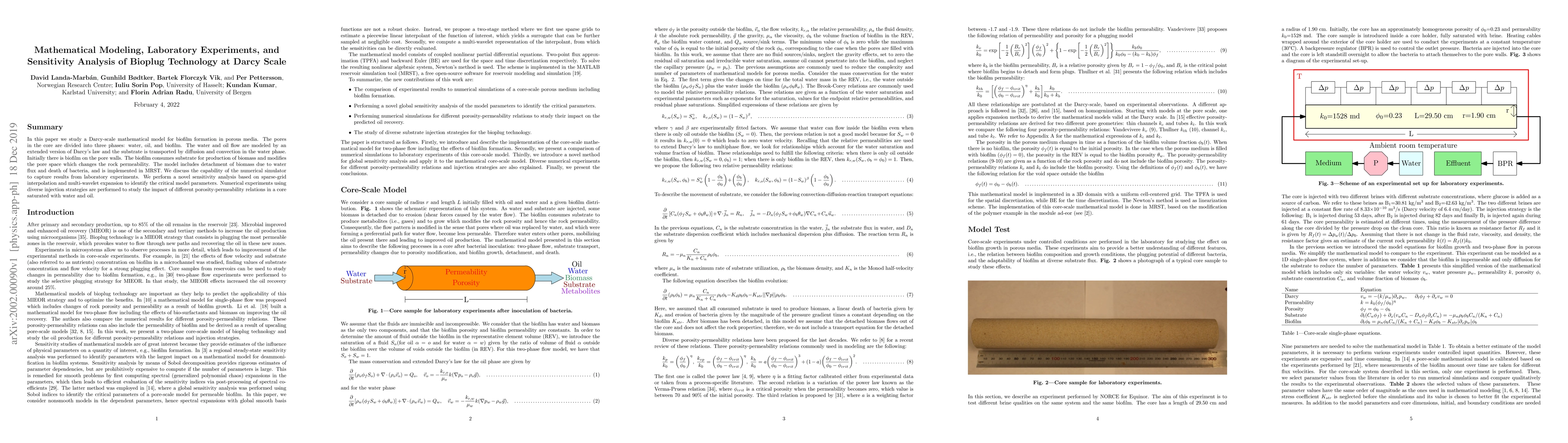 In this paper we study a Darcy-scale mathematical model for biofilm formation in porous media. The pores in the core are divided into three phases: water, oil, and biofilm. The water and oil flow are modeled by an extended version of Darcy's law and the substrate is transported by diffusion and convection in the water phase. Initially there is biofilm on the pore walls. The biofilm consumes substrate for production of biomass and modifies the pore space which changes the rock permeability. The model includes detachment of biomass due to water flux and death of bacteria, and is implemented in MRST. We discuss the capability of the numerical simulator to capture results from laboratory experiments. We perform a novel sensitivity analysis based on sparse-grid interpolation and multi-wavelet expansion to identify the critical model parameters. Numerical experiments using diverse injection strategies are performed to study the impact of different porosity-permeability relations in a core saturated with water and oil.