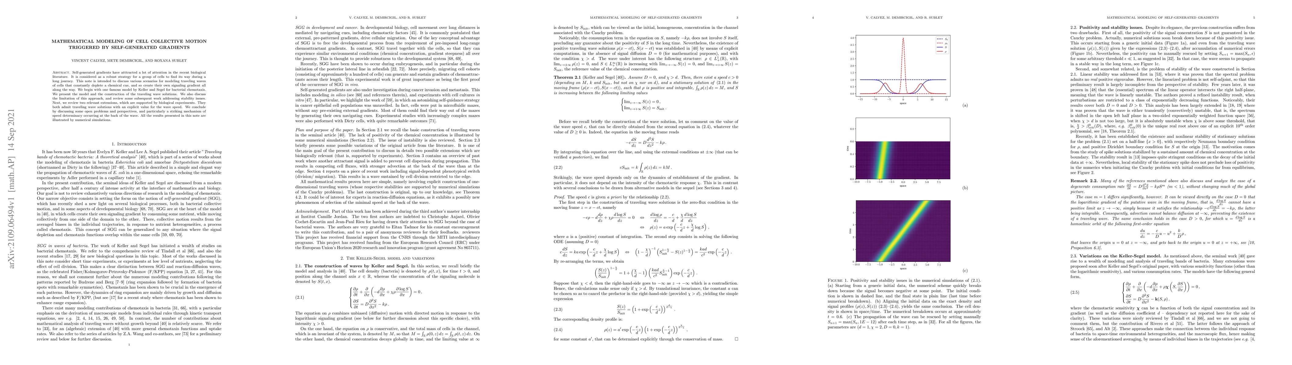 This paper discusses mathematical models of cell collective motion driven by self-generated gradients, focusing on traveling wave solutions. It reviews the Keller-Segel model for bacterial chemotaxis, its limitations, and extensions with explicit wave speeds. The study also highlights a unique speed determinacy mechanism at the wave's rear, supported by numerical simulations.
