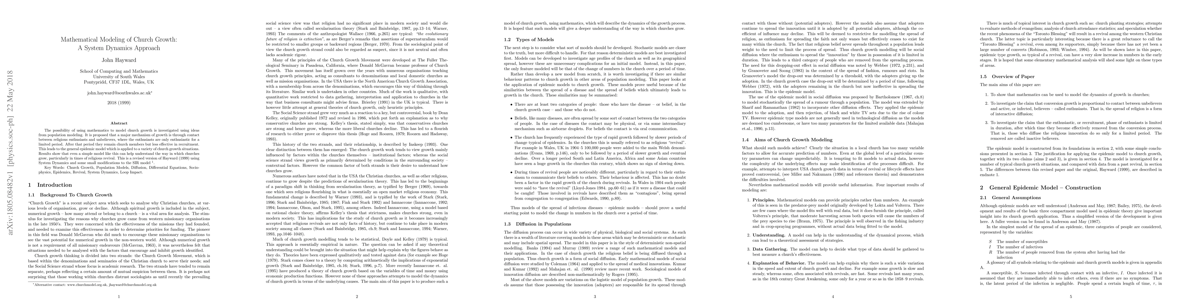 The possibility of using mathematics to model church growth is investigated using ideas from population modeling. It is proposed that a major mechanism of growth is through contact between religious enthusiasts and unbelievers, where the enthusiasts are only enthusiastic for a limited period. After that period they remain church members but less effective in recruitment. This leads to the general epidemic model which is applied to a variety of church growth situations. Results show that even a simple model like this can help understand the way in which churches grow, particularly in times of religious revival. This is a revised version of Hayward (1999) using System Dynamics and some small modifications to the SIR model.