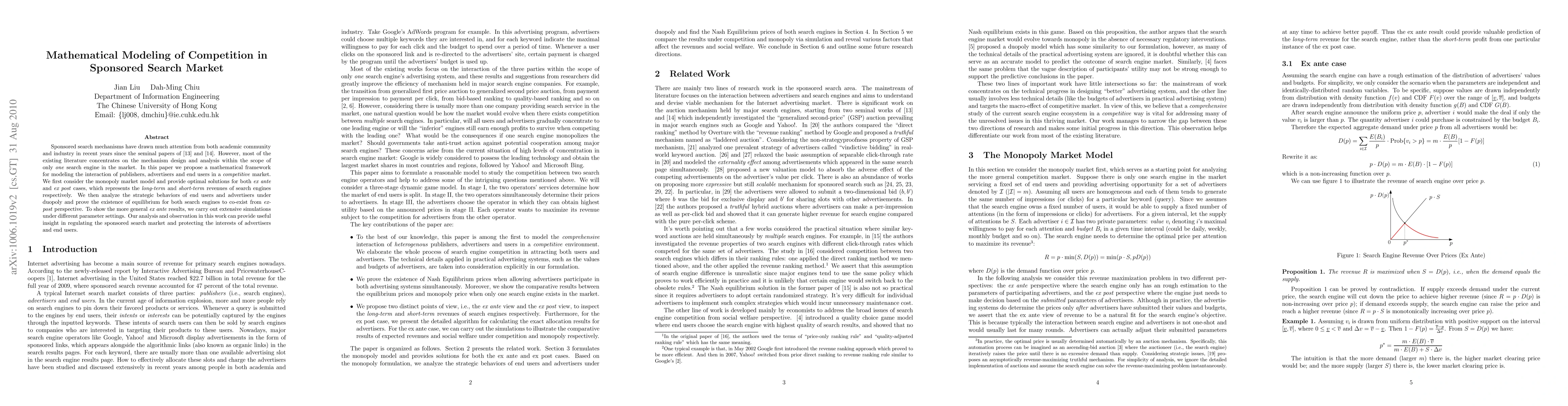 This paper proposes a mathematical framework to model interactions in the sponsored search market, analyzing both monopoly and duopoly scenarios. It provides optimal solutions for long-term and short-term revenues and proves the existence of equilibrium for competing search engines, offering insights for market regulation.
