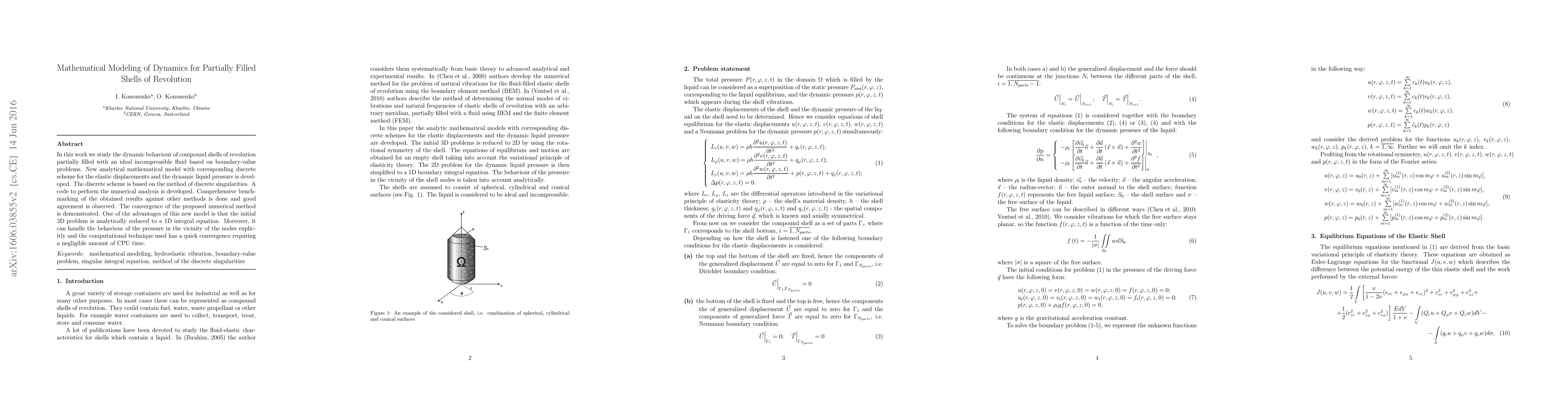 In this work we study the dynamic behaviour of compound shells of revolution partially filled with an ideal incompressible fluid based on boundary-value problems. New analytical mathematical model with corresponding discrete scheme for the elastic displacements and the dynamic liquid pressure is developed. The discrete scheme is based on the method of discrete singularities. A code to perform the numerical analysis is developed. Comprehensive benchmarking of the obtained results against other methods is done and good agreement is observed. The convergence of the proposed numerical method is demonstrated. One of the advantages of this new model is that the initial 3D problem is analytically reduced to a 1D integral equation. Moreover, it can handle the behaviour of the pressure in the vicinity of the nodes explicitly and the computational technique used has a quick convergence requiring a negligible amount of CPU time.