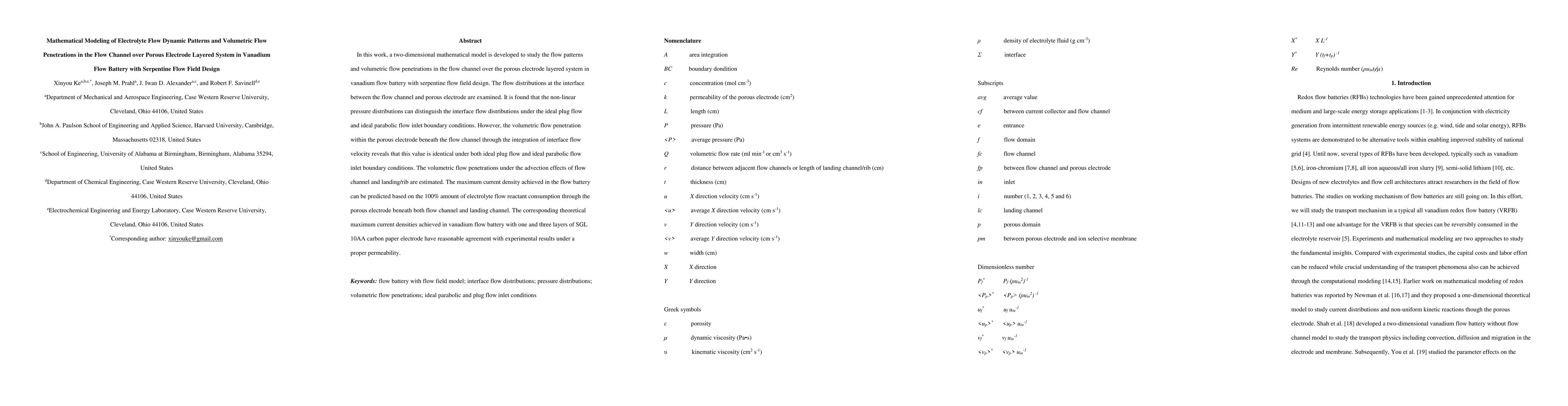 This paper develops a 2D mathematical model to analyze electrolyte flow dynamics and volumetric flow penetrations in a vanadium flow battery with a serpentine flow field. The study reveals that while pressure distributions differ under plug and parabolic flow conditions, volumetric flow penetration remains consistent, and theoretical maximum current densities align well with experimental data for single and multi-layered electrodes.