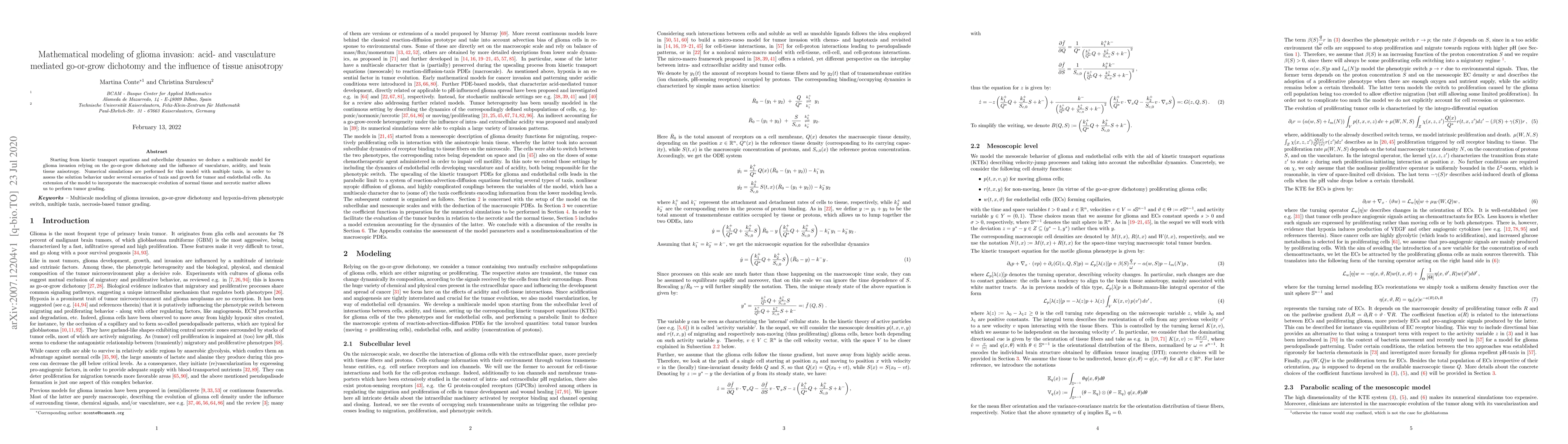 This paper develops a multiscale mathematical model for glioma invasion, incorporating the go-or-grow dichotomy, vasculature, acidity, and tissue anisotropy. Numerical simulations assess tumor and endothelial cell behavior under various conditions, and the model extension enables tumor grading.