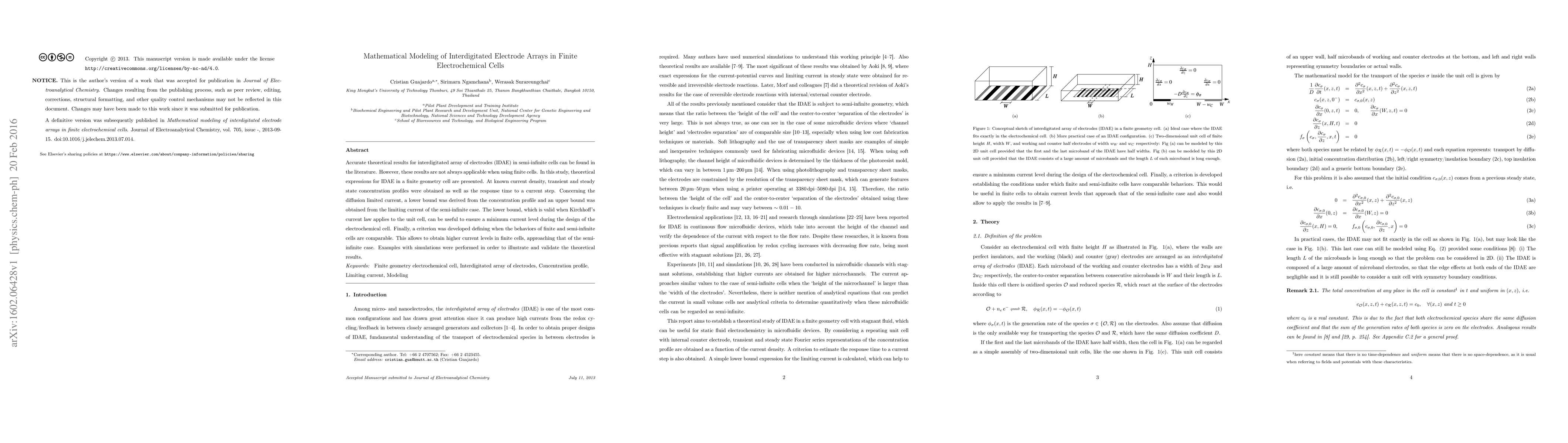 This paper presents theoretical models for interdigitated electrode arrays in finite electrochemical cells, deriving expressions for transient and steady-state concentration profiles and the response time. It establishes bounds for the diffusion-limited current and provides a criterion for comparing finite and semi-infinite cell behaviors, aiding in the design of electrochemical cells.
