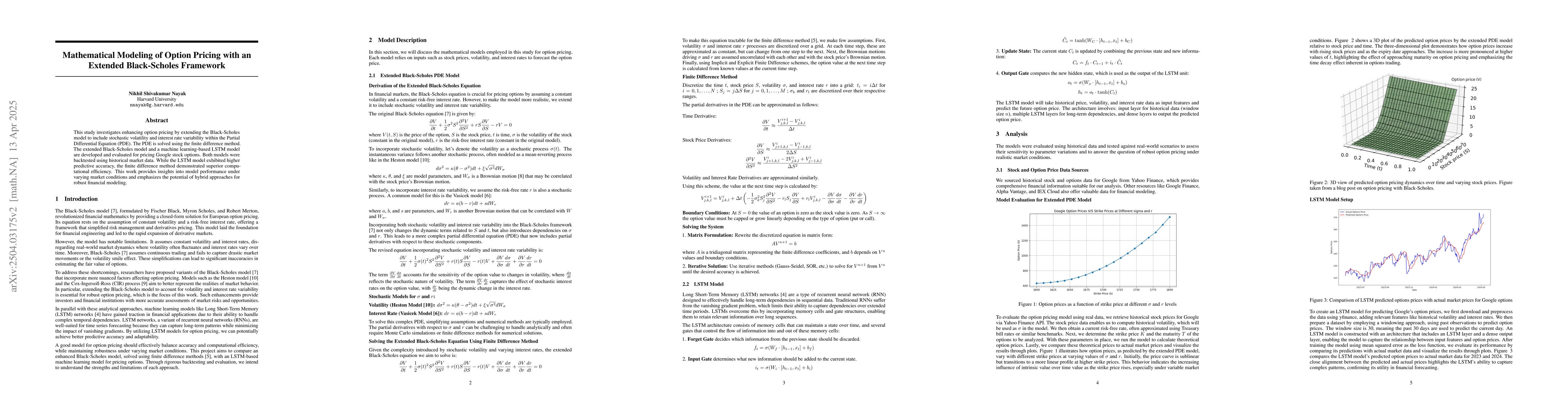 The research extends the Black-Scholes model by incorporating stochastic volatility and interest rate variability into a Partial Differential Equation (PDE), solved via the finite difference method. Additionally, a machine learning-based LSTM model is developed for comparison.