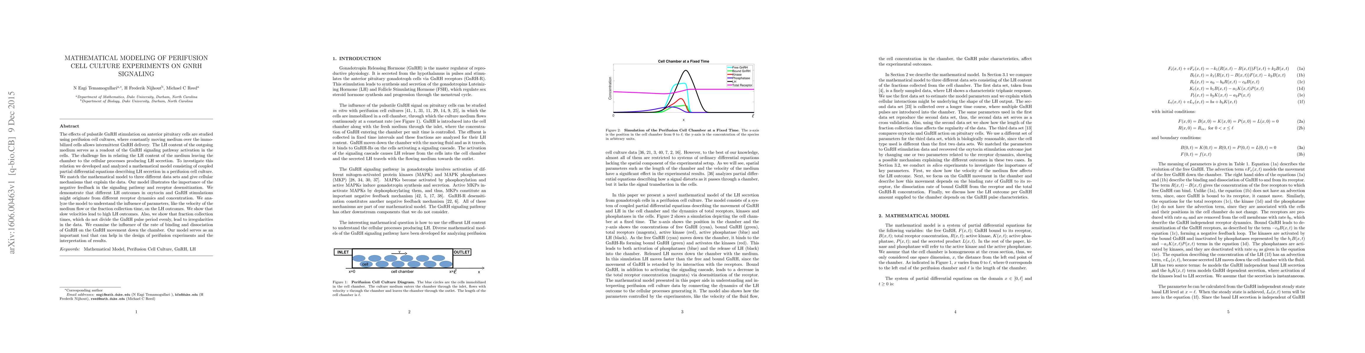 The effects of pulsatile GnRH stimulation on anterior pituitary cells are studied using perifusion cell cultures, where constantly moving medium over the immo- bilized cells allows intermittent GnRH delivery. The LH content of the outgoing medium serves as a readout of the GnRH signaling pathway activation in the cells. The challenge lies in relating the LH content of the medium leaving the chamber to the cellular processes producing LH secretion. To investigate this relation we developed and analyzed a mathematical model consisting of coupled partial differential equations describing LH secretion in a perifusion cell culture. We match the mathematical model to three different data sets and give cellular mechanisms that explain the data. Our model illustrates the importance of the negative feedback in the signaling pathway and receptor desensitization. We demonstrate that different LH outcomes in oxytocin and GnRH stimulations might originate from different receptor dynamics and concentration. We ana- lyze the model to understand the influence of parameters, like the velocity of the medium flow or the fraction collection time, on the LH outcomes. We show that slow velocities lead to high LH outcomes. Also, we show that fraction collection times, which do not divide the GnRH pulse period evenly, lead to irregularities in the data. We examine the influence of the rate of binding and dissociation of GnRH on the GnRH movement down the chamber. Our model serves as an important tool that can help in the design of perifusion experiments and the interpretation of results.