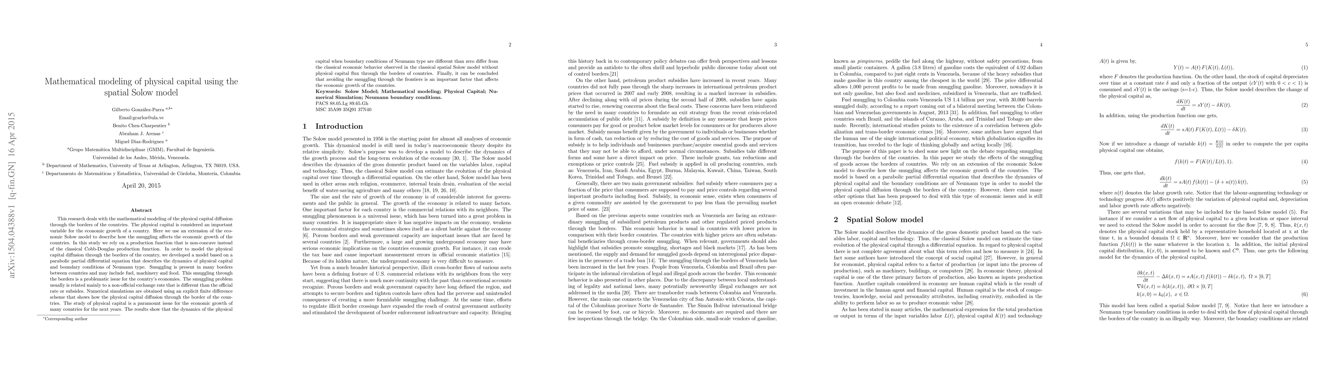 This research deals with the mathematical modeling of the physical capital diffusion through the borders of the countries. The physical capital is considered an important variable for the economic growth of a country. Here we use an extension of the economic Solow model to describe how the smuggling affects the economic growth of the countries. In this study we rely on a production function that is non-concave instead of the classical Cobb-Douglas production function. In order to model the physical capital diffusion through the borders of the country, we developed a model based on a parabolic partial differential equation that describes the dynamics of physical capital and boundary conditions of Neumann type. Smuggling is present in many borders between countries and may include fuel, machinery and food. This smuggling through the borders is a problematic issue for the country's economies. The smuggling problem usually is related mainly to a non-official exchange rate that is different than the official rate or subsides. Numerical simulations are obtained using an explicit finite difference scheme that shows how the physical capital diffusion through the border of the countries. The study of physical capital is a paramount issue for the economic growth of many countries for the next years. The results show that the dynamics of the physical capital when boundary conditions of Neumann type are different than zero differ from the classical economic behavior observed in the classical spatial Solow model without physical capital flux through the borders of countries. Finally, it can be concluded that avoiding the smuggling through the frontiers is an important factor that affects the economic growth of the countries.