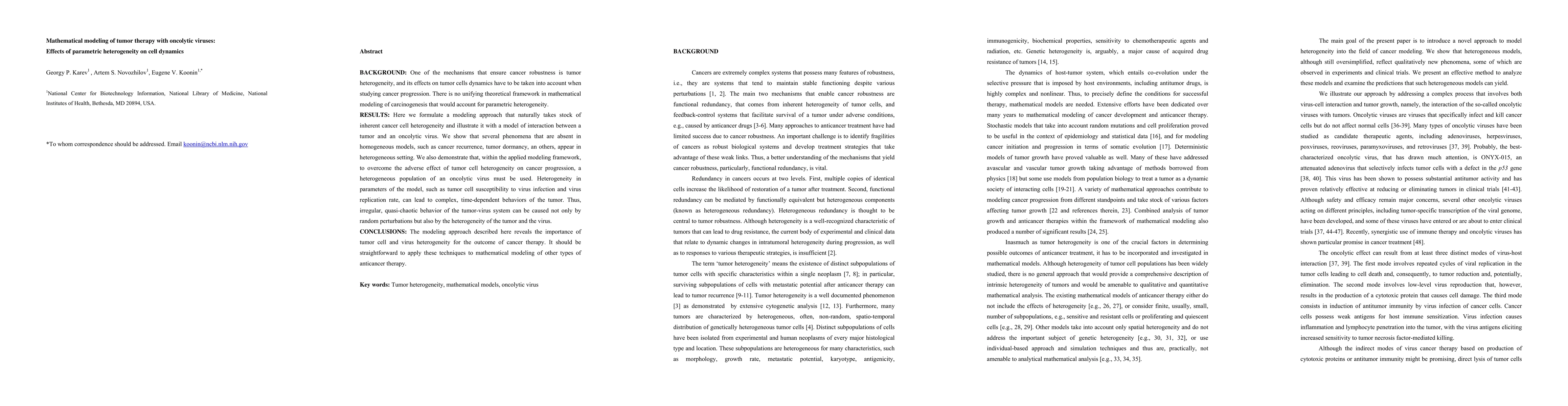 One of the mechanisms that ensure cancer robustness is tumor heterogeneity, and its effects on tumor cells dynamics have to be taken into account when studying cancer progression. There is no unifying theoretical framework in mathematical modeling of carcinogenesis that would account for parametric heterogeneity. Here we formulate a modeling approach that naturally takes stock of inherent cancer cell heterogeneity and illustrate it with a model of interaction between a tumor and an oncolytic virus. We show that several phenomena that are absent in homogeneous models, such as cancer recurrence, tumor dormancy, an others, appear in heterogeneous setting. We also demonstrate that, within the applied modeling framework, to overcome the adverse effect of tumor cell heterogeneity on cancer progression, a heterogeneous population of an oncolytic virus must be used. Heterogeneity in parameters of the model, such as tumor cell susceptibility to virus infection and virus replication rate, can lead to complex, time-dependent behaviors of the tumor. Thus, irregular, quasi-chaotic behavior of the tumor-virus system can be caused not only by random perturbations but also by the heterogeneity of the tumor and the virus. The modeling approach described here reveals the importance of tumor cell and virus heterogeneity for the outcome of cancer therapy. It should be straightforward to apply these techniques to mathematical modeling of other types of anticancer therapy.