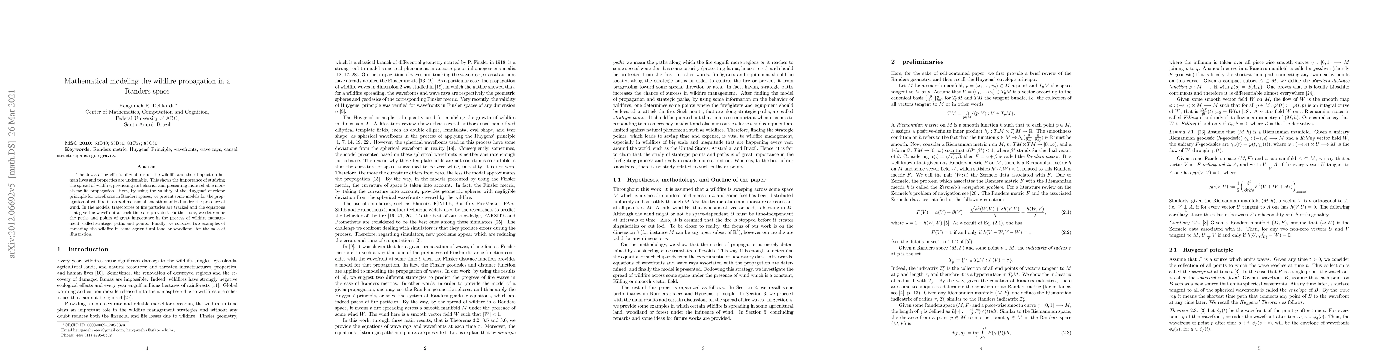 This paper develops mathematical models for wildfire propagation in Randers spaces, utilizing the Huygens' envelope principle to track fire particle trajectories and predict wildfire behavior under wind influence. The study identifies strategic paths and points crucial for wildfire management and provides examples for agricultural land and woodland scenarios.