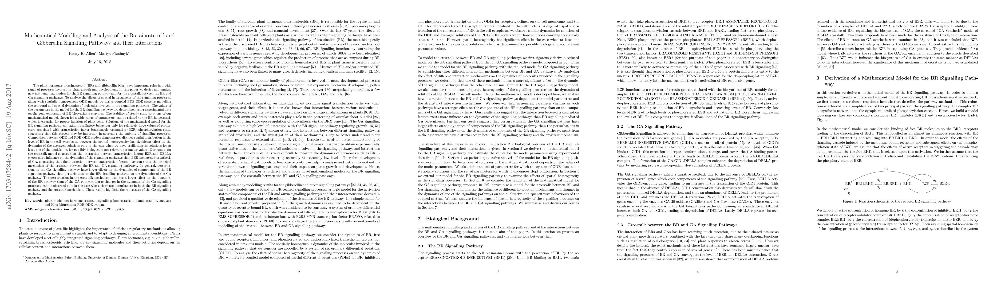 This paper develops mathematical models for brassinosteroid (BR) and gibberellin (GA) signalling pathways, including their interactions, and uses coupled PDE-ODE systems to analyze spatial and temporal dynamics. The study finds that transcription factor interactions, rather than biosynthesis, primarily drive crosstalk between BR and GA pathways.