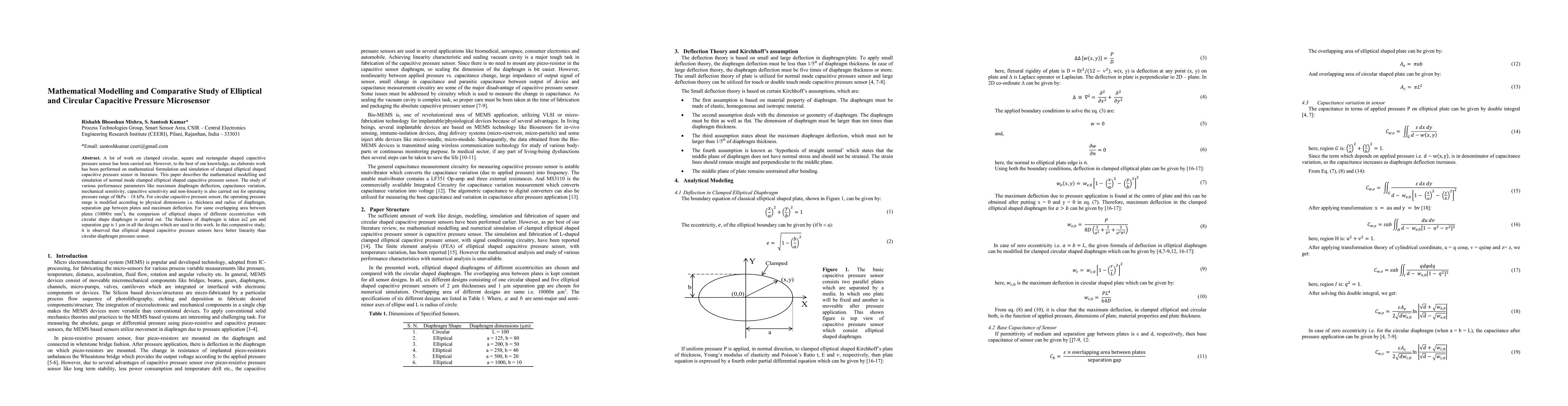 This paper presents a mathematical model and simulation of a clamped elliptical capacitive pressure sensor, comparing its performance with a circular counterpart. The study finds that elliptical sensors exhibit better linearity over the pressure range of 0 to 18 kPa, despite having the same overlapping area.