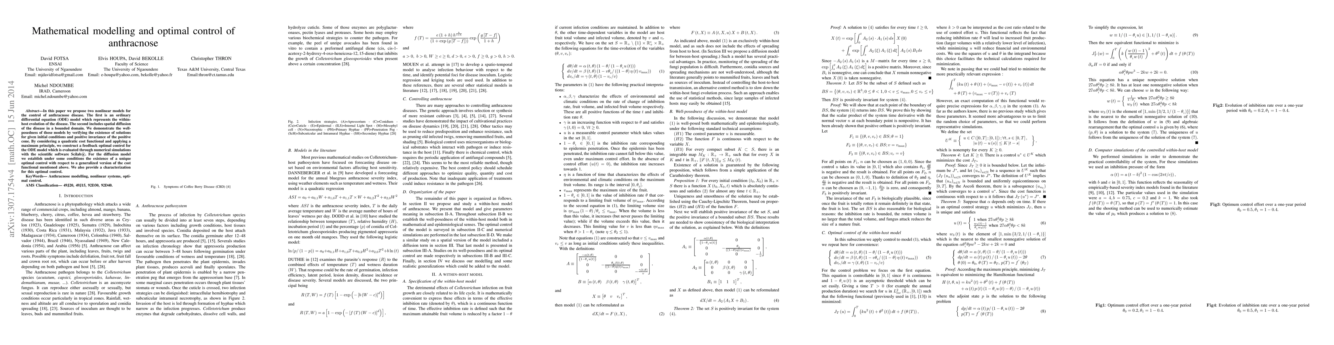 In this paper we propose two nonlinear models for the control of anthracnose disease. The first is an ordinary differential equation (ODE) model which represents the within-host evolution of the disease. The second includes spatial diffusion of the disease in a bounded domain. We demonstrate the well-posedness of those models by verifying the existence of solutions for given initial conditions and positive invariance of the positive cone. By considering a quadratic cost functional and applying a maximum principle, we construct a feedback optimal control for the ODE model which is evaluated through numerical simulations with the scientific software Scilab. For the diffusion model we establish under some conditions the existence of an optimal control with respect to a generalized version of the cost functional mentioned above. We also provide a characterization for this optimal control.