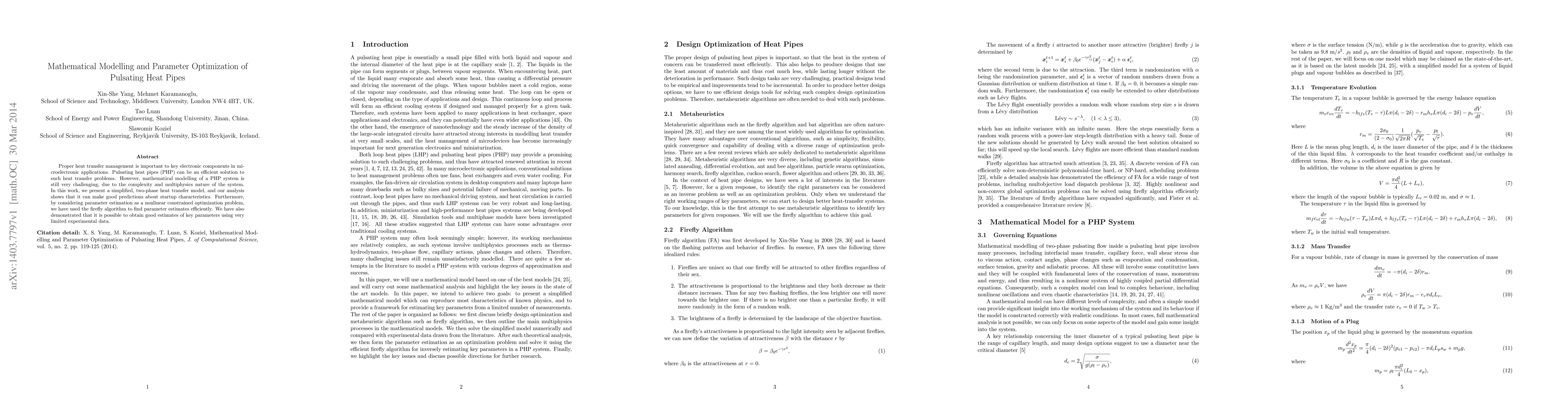 Researchers developed a simplified model for pulsating heat pipes to predict startup characteristics and used optimization techniques to efficiently estimate key parameters with limited experimental data.