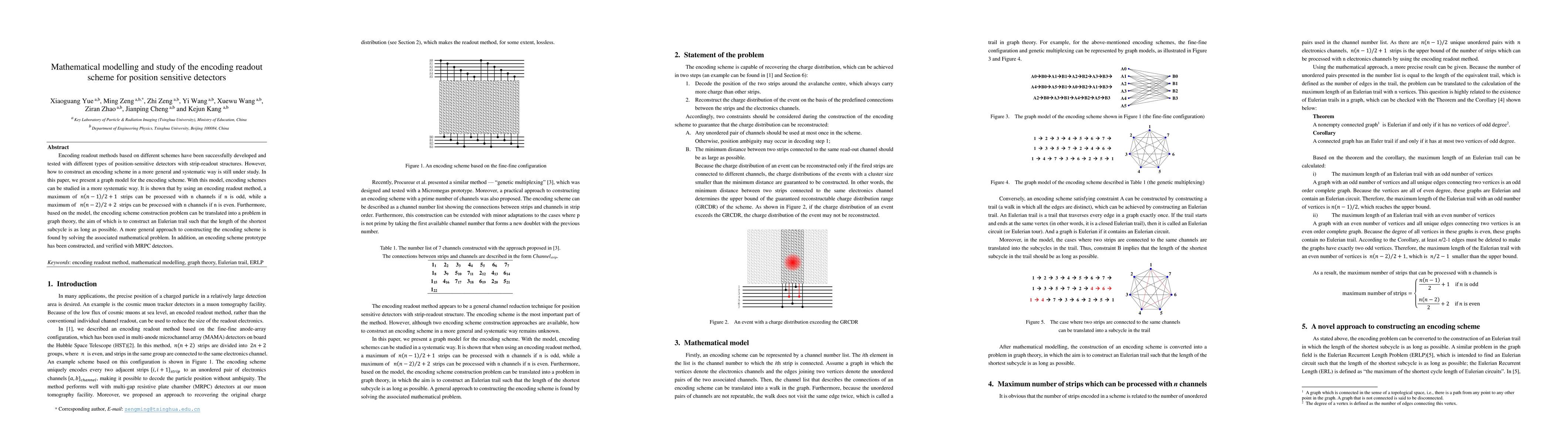 This paper introduces a graph model to systematically study encoding schemes for position-sensitive detectors, showing optimal strip processing based on channel count and deriving a mathematical problem to construct efficient encoding schemes. An Eulerian trail approach is used to maximize the length of the shortest subcycle, leading to a prototype verified with MRPC detectors.