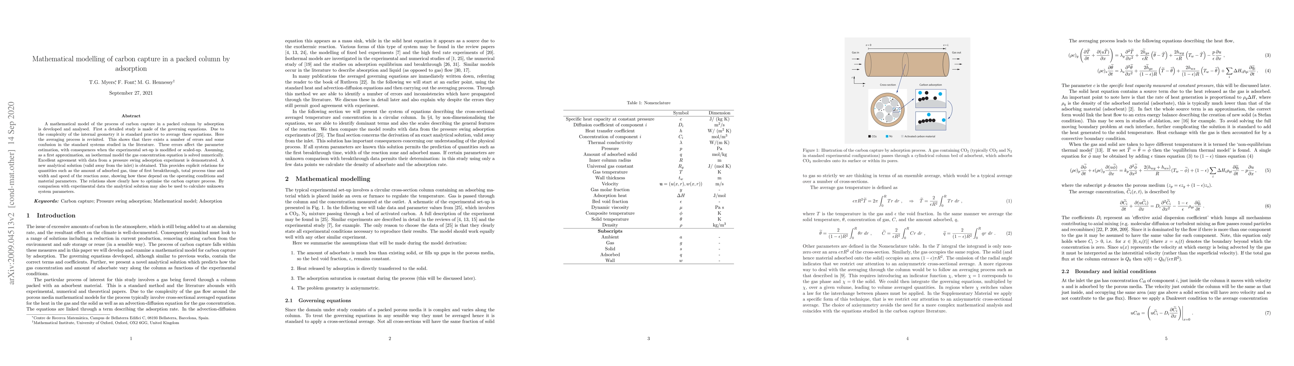 This paper develops a mathematical model for carbon capture in a packed column via adsorption, identifying errors in standard averaging methods used in literature. The authors provide a new analytical solution that accurately predicts key process parameters, demonstrating its effectiveness through comparison with experimental data.