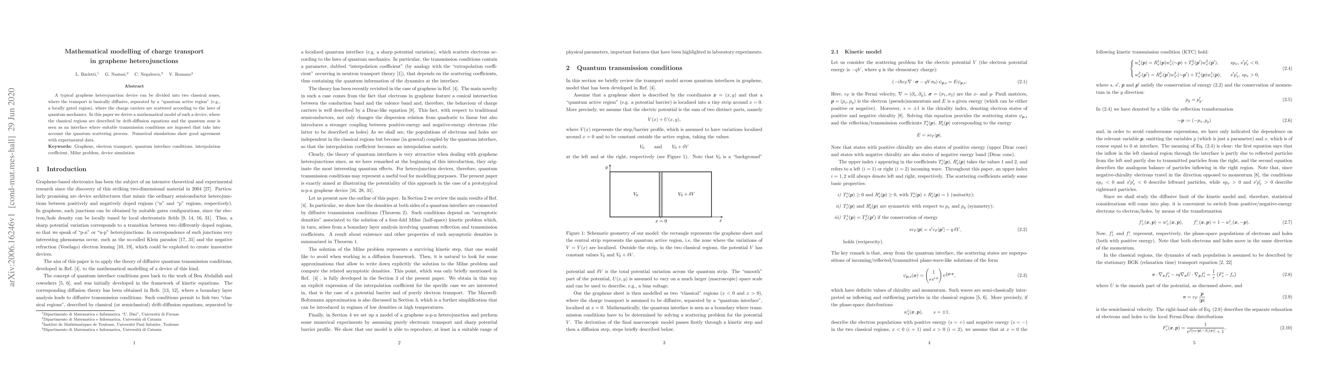 A typical graphene heterojunction device can be divided into two classical zones, where the transport is basically diffusive, separated by a "quantum active region" (e.g., a locally gated region), where the charge carriers are scattered according to the laws of quantum mechanics.In this paper we derive a mathematical model of such a device, where the classical regions are described by drift-diffusion equations and the quantum zone is seen as an interface where suitable transmission conditions are imposed that take into account the quantum scattering process. Numerical simulations show good agreement with experimental data.