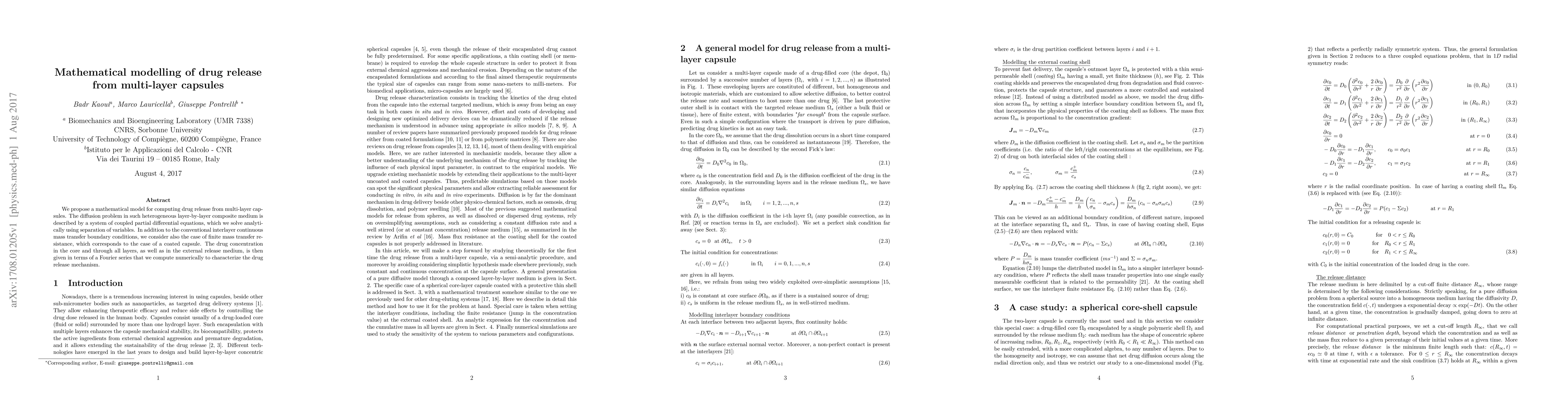 This paper proposes a mathematical model to compute drug release from multi-layer capsules using a system of coupled partial differential equations solved analytically. The model considers both continuous and finite mass transfer resistance scenarios to characterize drug concentration and release mechanisms through Fourier series.