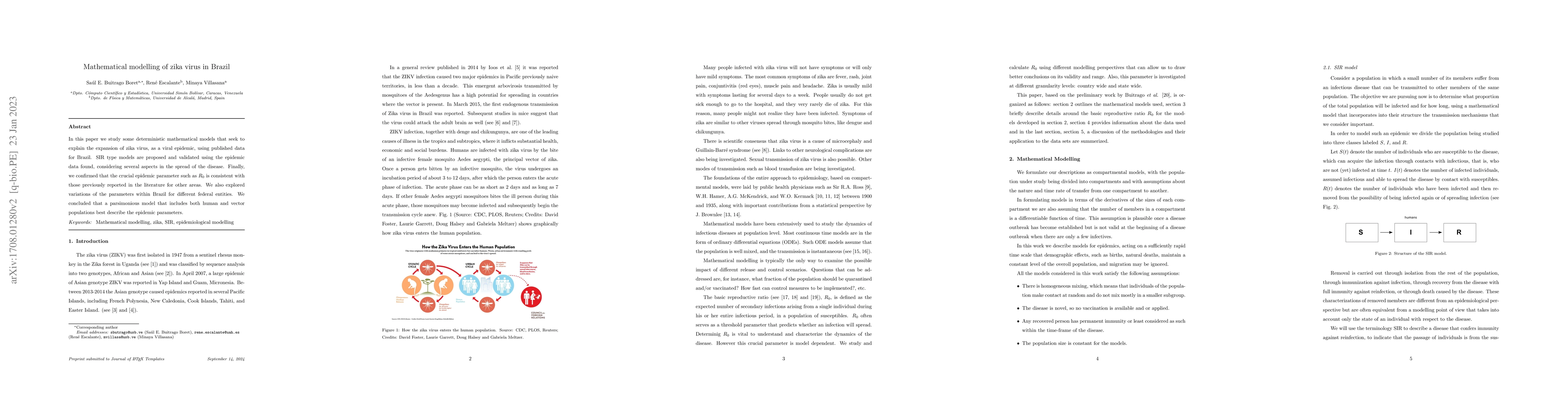 In this paper we study some deterministic mathematical models that seek to explain the expansion of zika virus, as a viral epidemic, using published data for Brazil. SIR type models are proposed and validated using the epidemic data found, considering several aspects in the spread of the disease. Finally, we confirmed that the crucial epidemic parameter such as $R_0$ is consistent with those previously reported in the literature for other areas. We also explored variations of the parameters within Brazil for different federal entities. We concluded that a parsimonious model that includes both human and vector populations best describe the epidemic parameters.