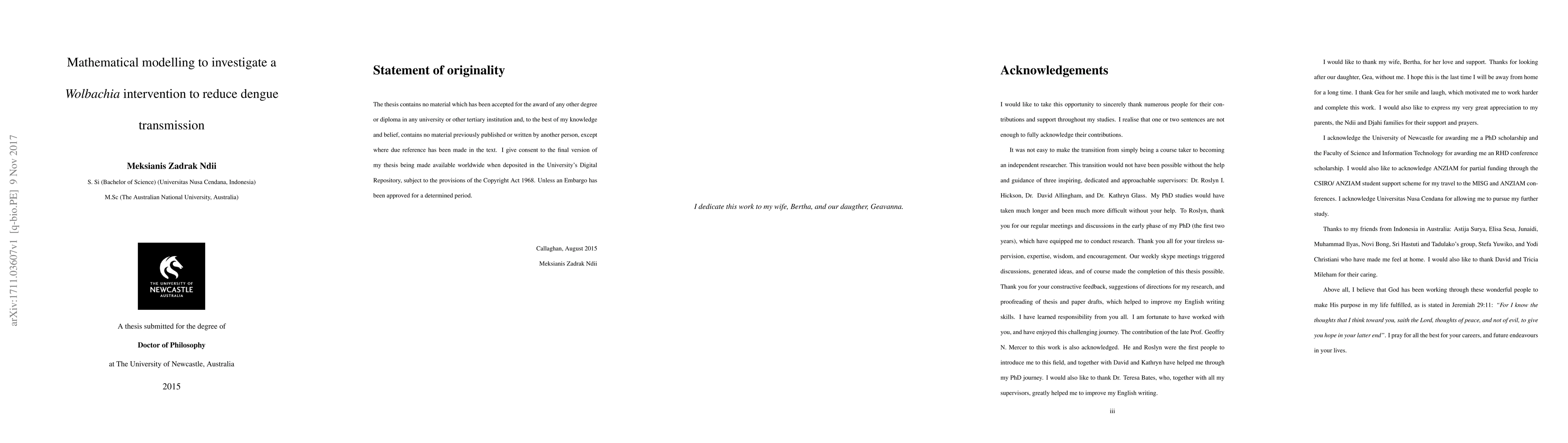 The introduction of Wolbachia-carrying mosquitoes into the population has recently been proposed as an alternative strategy against dengue. Although laboratory experiments have shown that the Wolbachia bacterium can reduce the levels of dengue virus in mosquitoes, it is also important to assess the performance of Wolbachia in reducing the incidence of dengue in human populations.In this thesis, deterministic mathematical models of human and mosquito populations in which either one or two dengue serotypes circulate are developed. We adapt these models to enable the investigation of dengue disease dynamics in the absence and presence of Wolbachia in order to assess the performance of Wolbachia as a strategy to reduce human dengue incidence. When studying the situation in which a single dengue serotype is present in the population, we consider scenarios where dengue is introduced into the human population once and multiple times.