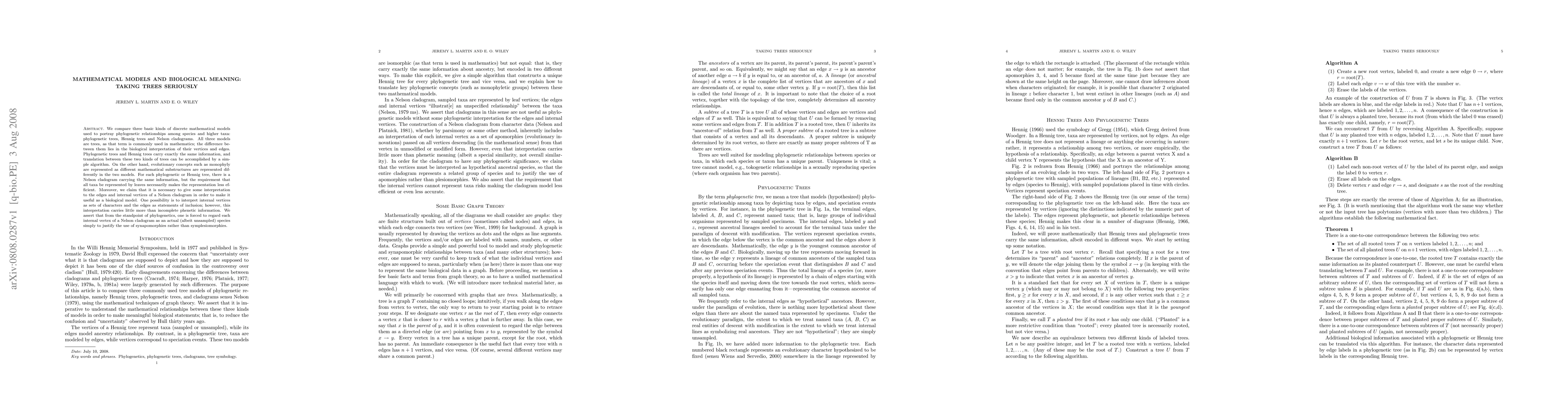 We compare three basic kinds of discrete mathematical models used to portray phylogenetic relationships among species and higher taxa: phylogenetic trees, Hennig trees and Nelson cladograms. All three models are trees, as that term is commonly used in mathematics; the difference between them lies in the biological interpretation of their vertices and edges. Phylogenetic trees and Hennig trees carry exactly the same information, and translation between these two kinds of trees can be accomplished by a simple algorithm. On the other hand, evolutionary concepts such as monophyly are represented as different mathematical substructures are represented differently in the two models. For each phylogenetic or Hennig tree, there is a Nelson cladogram carrying the same information, but the requirement that all taxa be represented by leaves necessarily makes the representation less efficient. Moreover, we claim that it is necessary to give some interpretation to the edges and internal vertices of a Nelson cladogram in order to make it useful as a biological model. One possibility is to interpret internal vertices as sets of characters and the edges as statements of inclusion; however, this interpretation carries little more than incomplete phenetic information. We assert that from the standpoint of phylogenetics, one is forced to regard each internal vertex of a Nelson cladogram as an actual (albeit unsampled) species simply to justify the use of synapomorphies rather than symplesiomorphies.