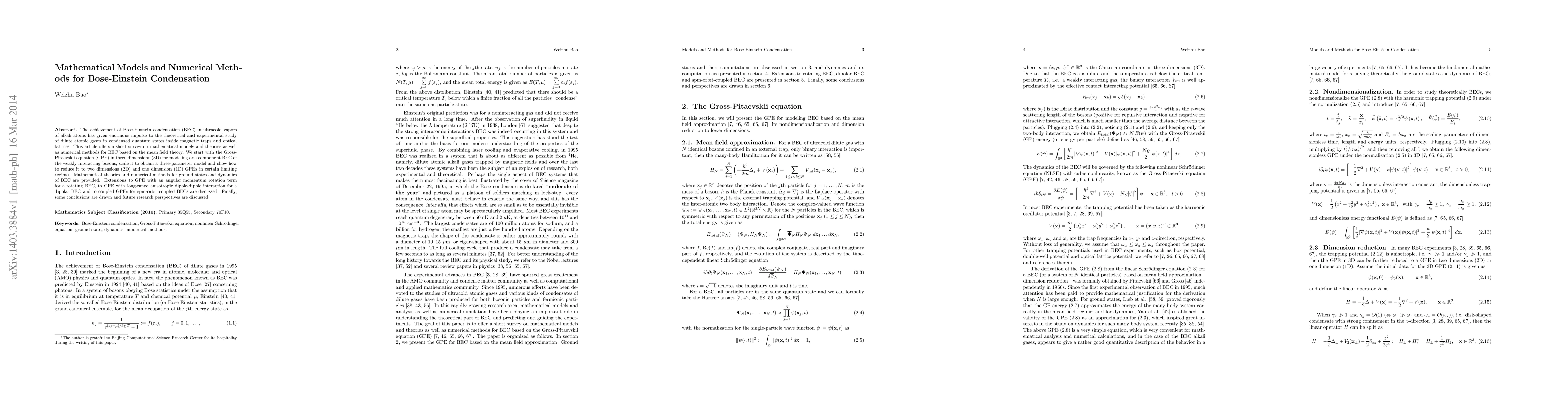 The paper offers a detailed review of mathematical models and numerical methods for BEC, including the Gross-Pitaevskii equation and its extensions, providing a valuable resource for researchers in the field.