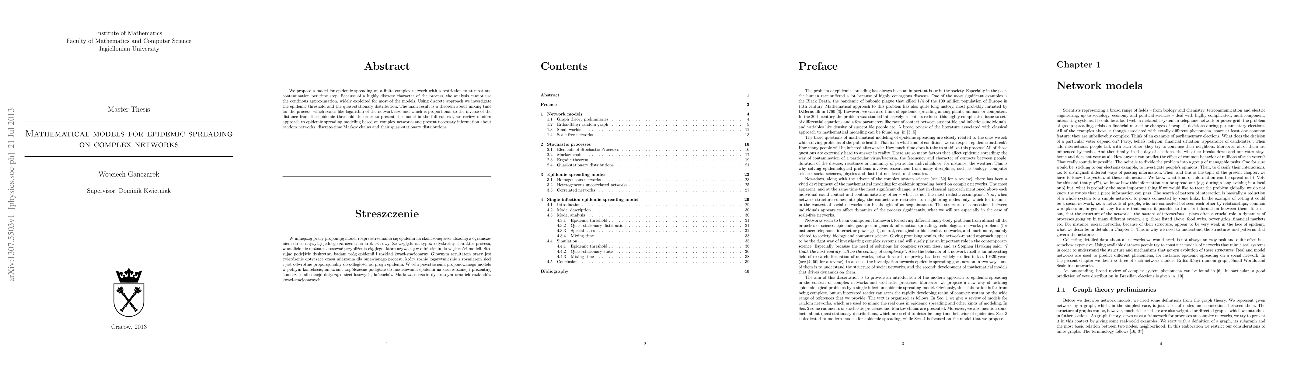 We propose a model for epidemic spreading on a finite complex network with a restriction to at most one contamination per time step. Because of a highly discrete character of the process, the analysis cannot use the continous approximation, widely exploited for most of the models. Using discrete approach we investigate the epidemic threshold and the quasi-stationary distribution. The main result is a theorem about mixing time for the process, which scales like logarithm of the network size and which is proportional to the inverse of the distance from the epidemic threshold. In order to present the model in the full context, we review modern approach to epidemic spreading modeling based on complex networks and present necessary information about random networks, discrete-time Markov chains and their quasi-stationary distributions.