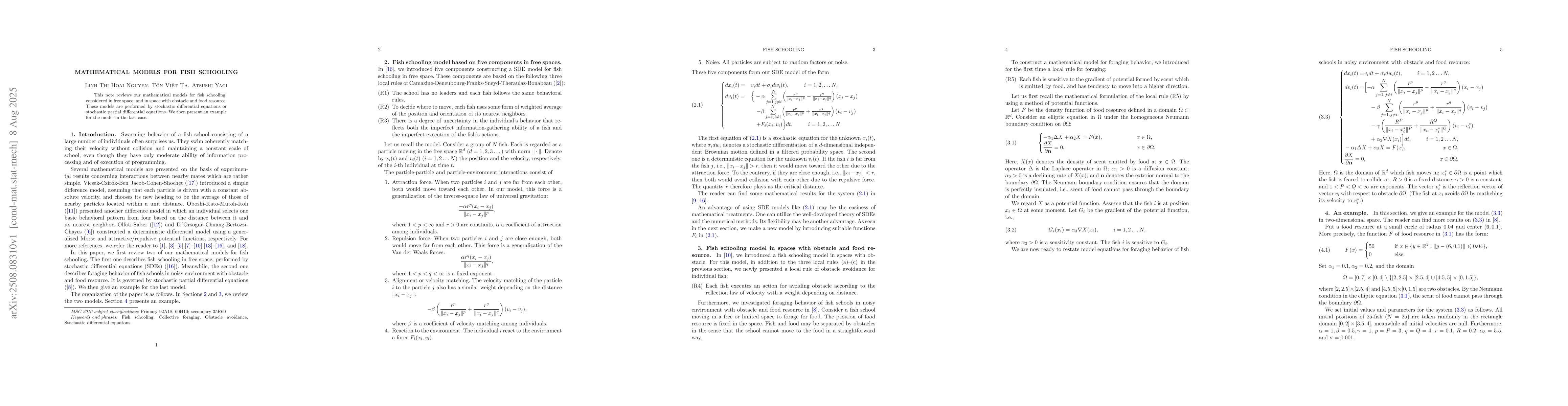 This note reviews our mathematical models for fish schooling, considered in free space, and in space with obstacle and food resource. These models are performed by stochastic differential equations or stochastic partial differential equations. We then present an example for the model in the last case.