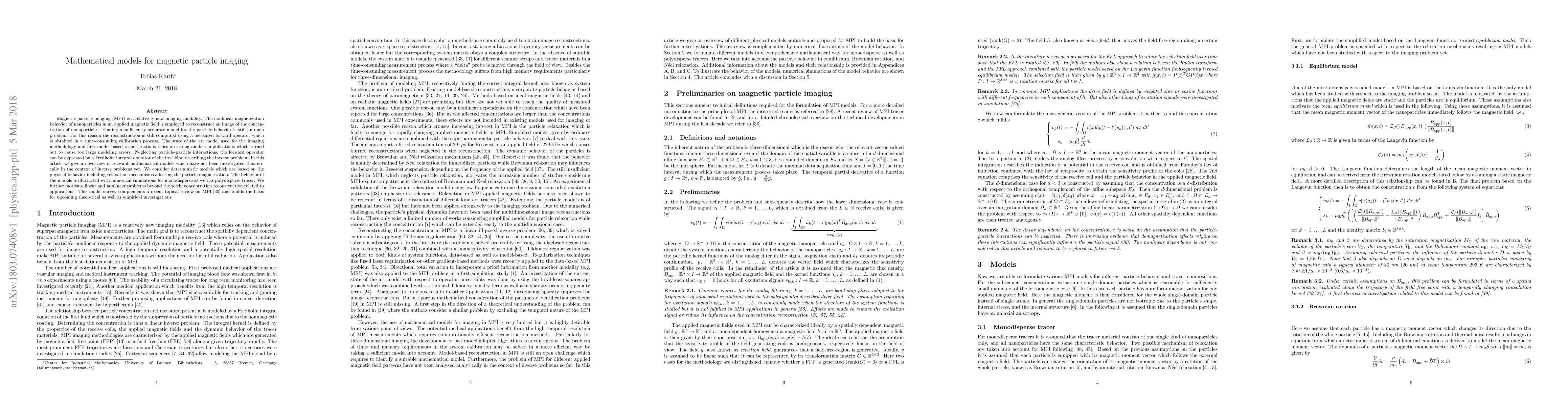 Magnetic particle imaging (MPI) is a relatively new imaging modality. The nonlinear magnetization behavior of nanoparticles in an applied magnetic field is employed to reconstruct an image of the concentration of nanoparticles. Finding a sufficiently accurate model for the particle behavior is still an open problem. For this reason the reconstruction is still computed using a measured forward operator which is obtained in a time-consuming calibration process. The state of the art model used for the imaging methodology and first model-based reconstructions relies on strong model simplifications which turned out to cause too large modeling errors. Neglecting particle-particle interactions, the forward operator can be expressed by a Fredholm integral operator of the first kind describing the inverse problem. In this article we give an overview of relevant mathematical models which have not been investigated theoretically in the context of inverse problems yet. We consider deterministic models which are based on the physical behavior including relaxation mechanisms affecting the particle magnetization. The behavior of the models is illustrated with numerical simulations for monodisperse as well as polydisperse tracer. We further motivate linear and nonlinear problems beyond the solely concentration reconstruction related to applications. This model survey complements a recent topical review on MPI [30] and builds the basis for upcoming theoretical as well as empirical investigations.