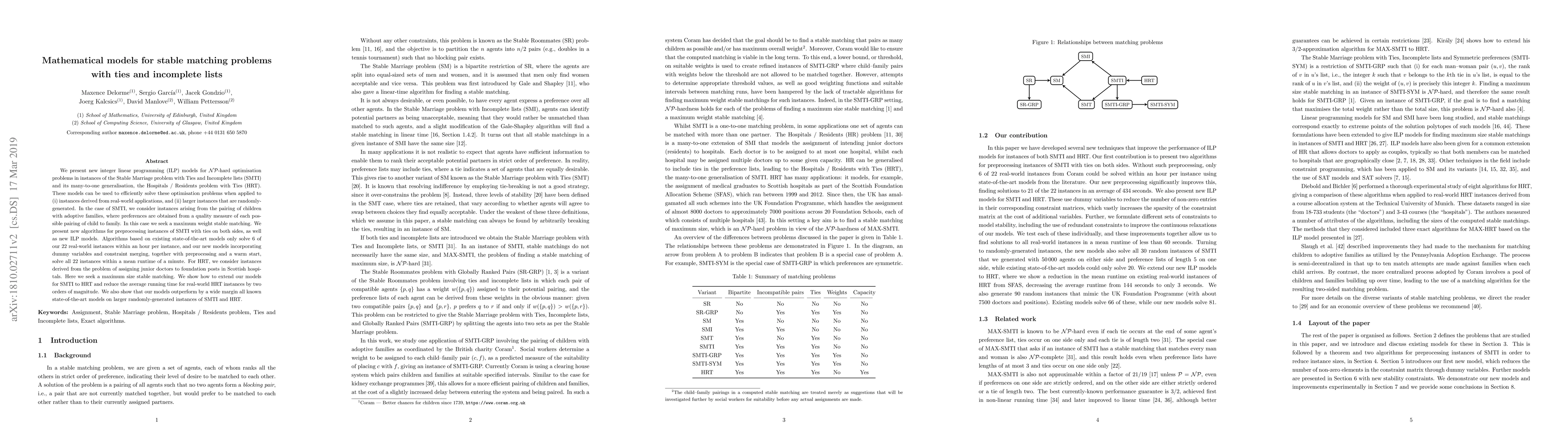 We present new integer linear programming (ILP) models for NP-hard optimisation problems in instances of the Stable Marriage problem with Ties and Incomplete lists (SMTI) and its many-to-one generalisation, the Hospitals / Residents problem with Ties (HRT). These models can be used to efficiently solve these optimisation problems when applied to (i) instances derived from real-world applications, and (ii) larger instances that are randomly-generated. In the case of SMTI, we consider instances arising from the pairing of children with adoptive families, where preferences are obtained from a quality measure of each possible pairing of child to family. In this case we seek a maximum weight stable matching. We present new algorithms for preprocessing instances of SMTI with ties on both sides, as well as new ILP models. Algorithms based on existing state-of-the-art models only solve 6 of our 22 real-world instances within an hour per instance, and our new models solve all 22 instances within a mean runtime of 60 seconds. For HRT, we consider instances derived from the problem of assigning junior doctors to foundation posts in Scottish hospitals. Here we seek a maximum size stable matching. We show how to extend our models for SMTI to the HRT case. For the real instances, we reduce the mean runtime from an average of 144 seconds when using state-of-the-art methods, to 3 seconds when using our new ILP-based algorithms. We also show that our models outperform considerably state-of-the-art models on larger randomly-generated instances of SMTI and HRT.