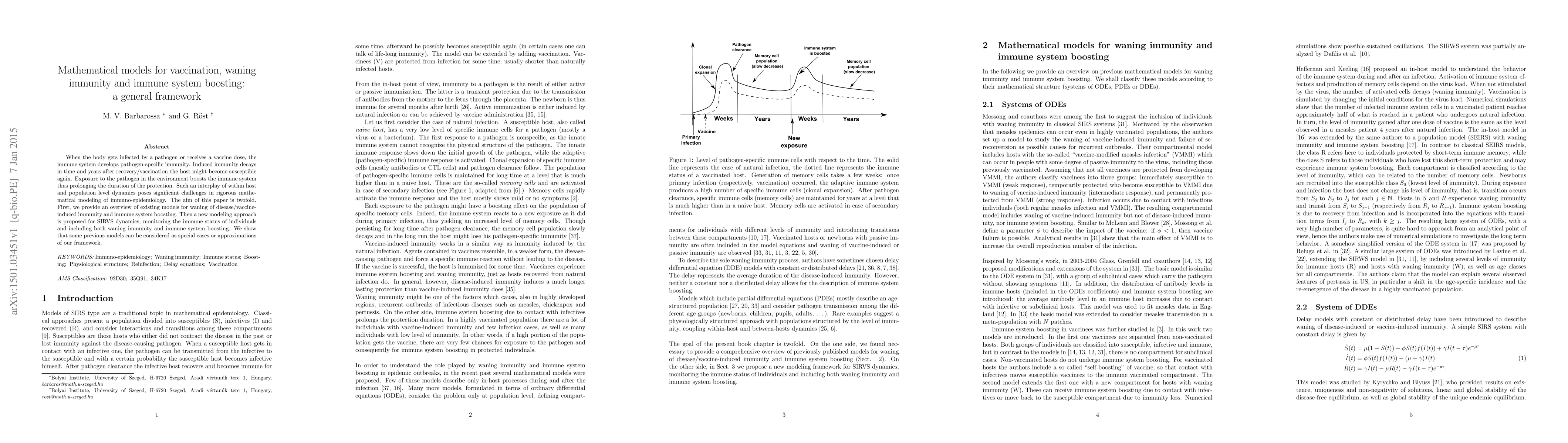 When the body gets infected by a pathogen or receives a vaccine dose, the immune system develops pathogen-specific immunity. Induced immunity decays in time and years after recovery/vaccination the host might become susceptible again. Exposure to the pathogen in the environment boosts the immune system thus prolonging the duration of the protection. Such an interplay of within host and population level dynamics poses significant challenges in rigorous mathematical modeling of immuno-epidemiology. The aim of this paper is twofold. First, we provide an overview of existing models for waning of disease/vaccine-induced immunity and immune system boosting. Then a new modeling approach is proposed for SIRVS dynamics, monitoring the immune status of individuals and including both waning immunity and immune system boosting. We show that some previous models can be considered as special cases or approximations of our framework.