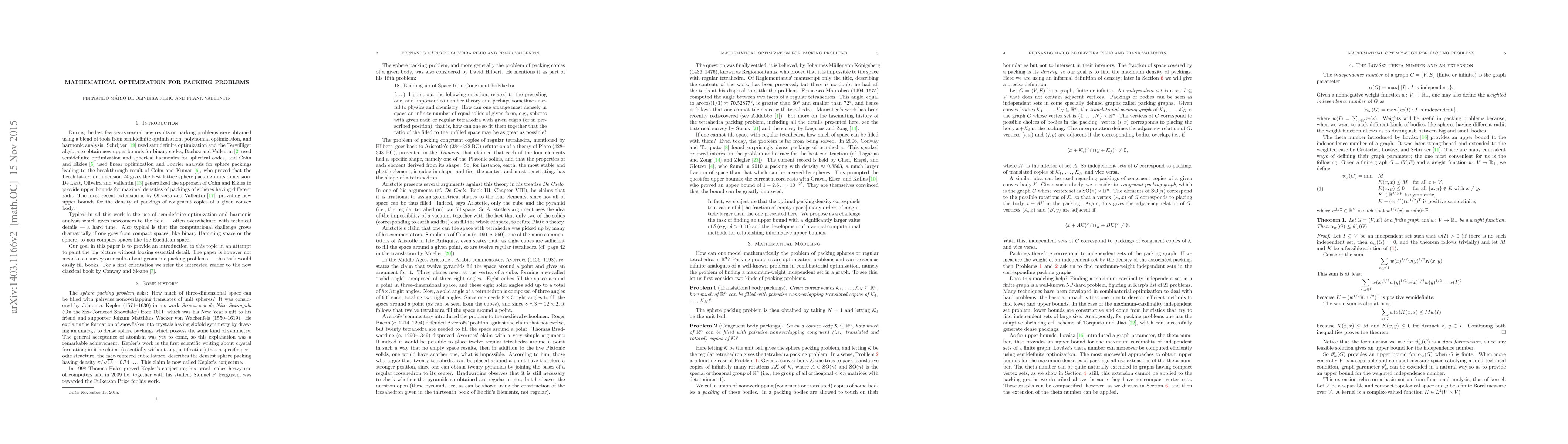 During the last few years several new results on packing problems were obtained using a blend of tools from semidefinite optimization, polynomial optimization, and harmonic analysis. We survey some of these results and the techniques involved, concentrating on geometric packing problems such as the sphere-packing problem or the problem of packing regular tetrahedra in R^3.