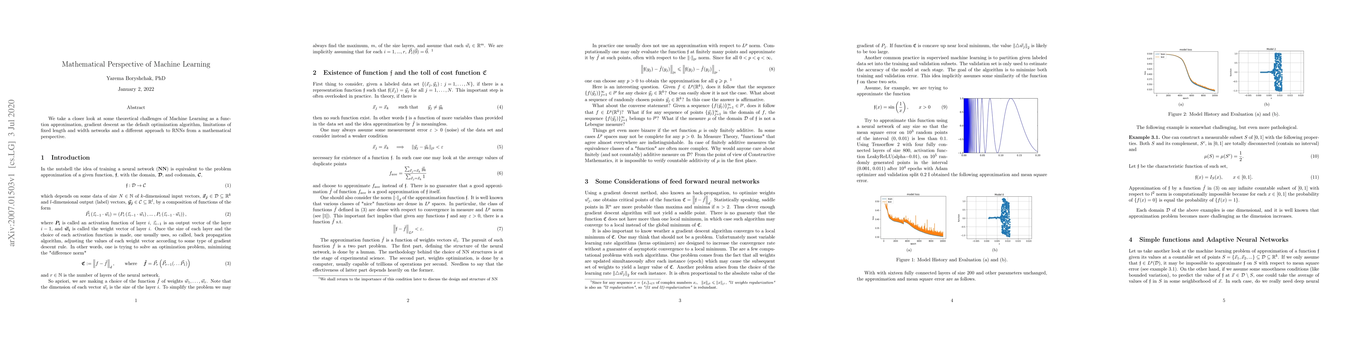 We take a closer look at some theoretical challenges of Machine Learning as a function approximation, gradient descent as the default optimization algorithm, limitations of fixed length and width networks and a different approach to RNNs from a mathematical perspective.