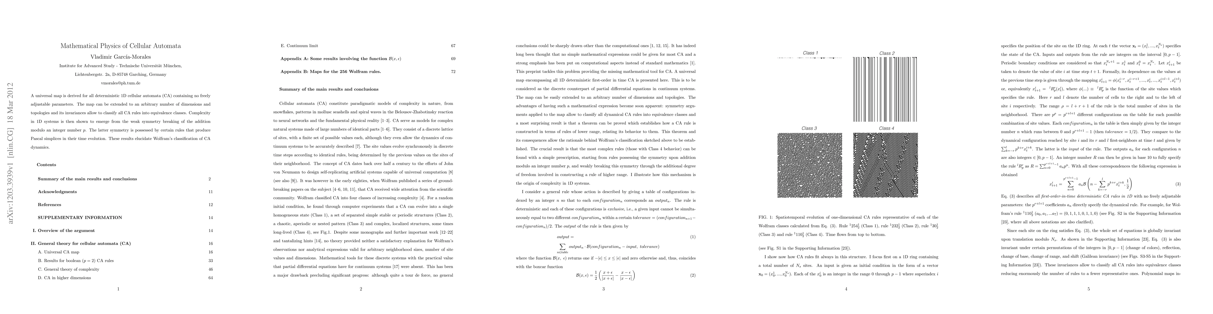 A universal map is derived for all deterministic 1D cellular automata (CA) containing no freely adjustable parameters. The map can be extended to an arbitrary number of dimensions and topologies and its invariances allow to classify all CA rules into equivalence classes. Complexity in 1D systems is then shown to emerge from the weak symmetry breaking of the addition modulo an integer number p. The latter symmetry is possessed by certain rules that produce Pascal simplices in their time evolution. These results elucidate Wolfram's classification of CA dynamics.