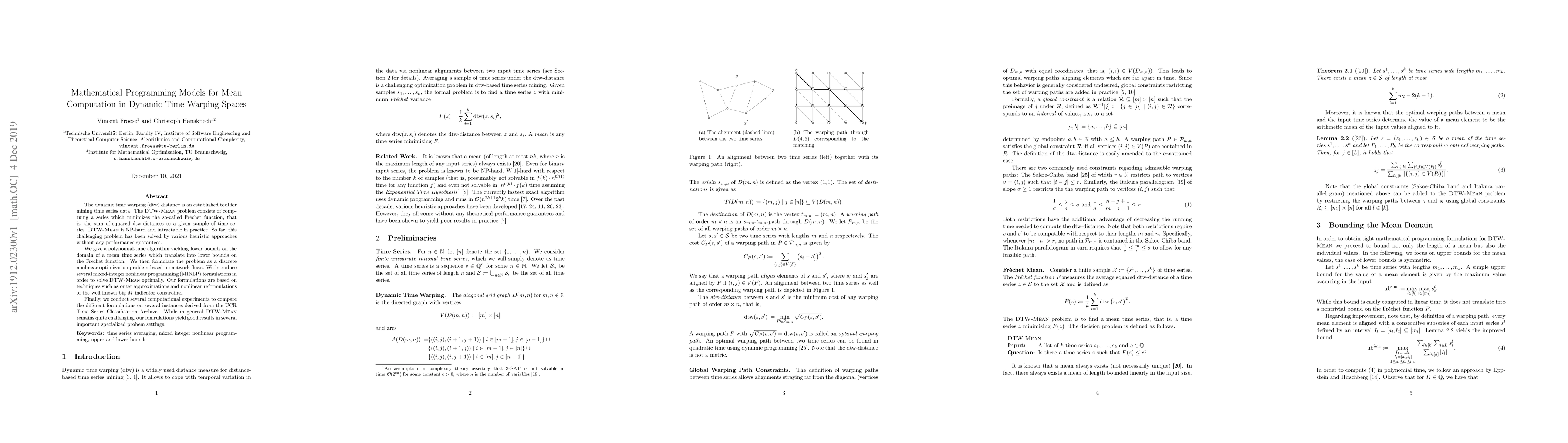 A new polynomial-time algorithm and mixed-integer nonlinear programming formulations are introduced to solve the DTW-Mean problem, which minimizes the sum of squared dynamic time warping distances in time series data.