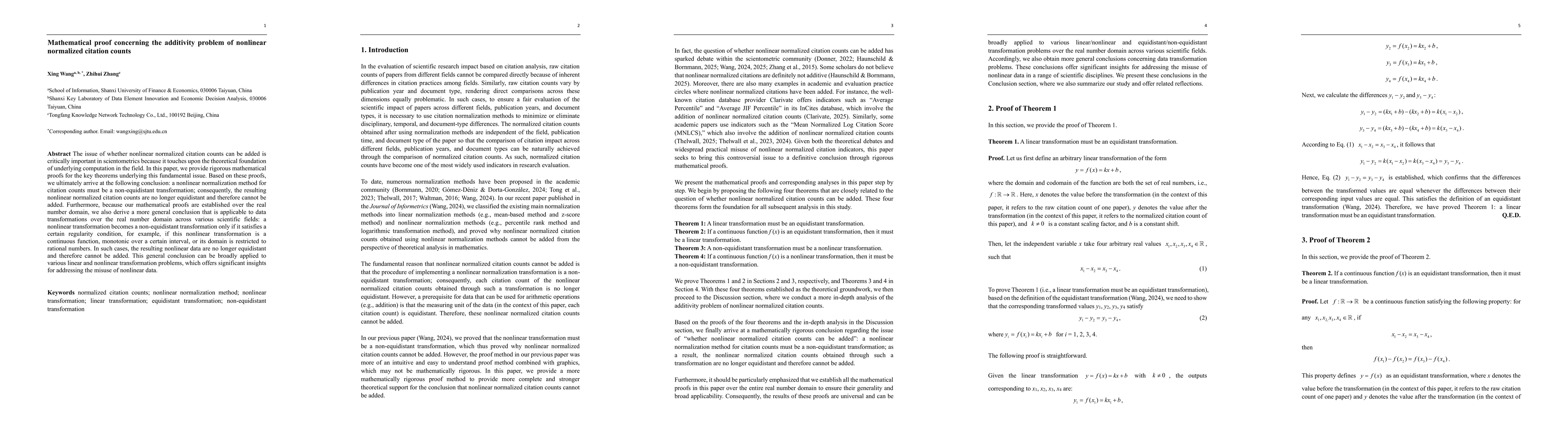 The paper provides rigorous mathematical proofs based on the real number domain to address the additivity problem of nonlinear normalized citation counts.