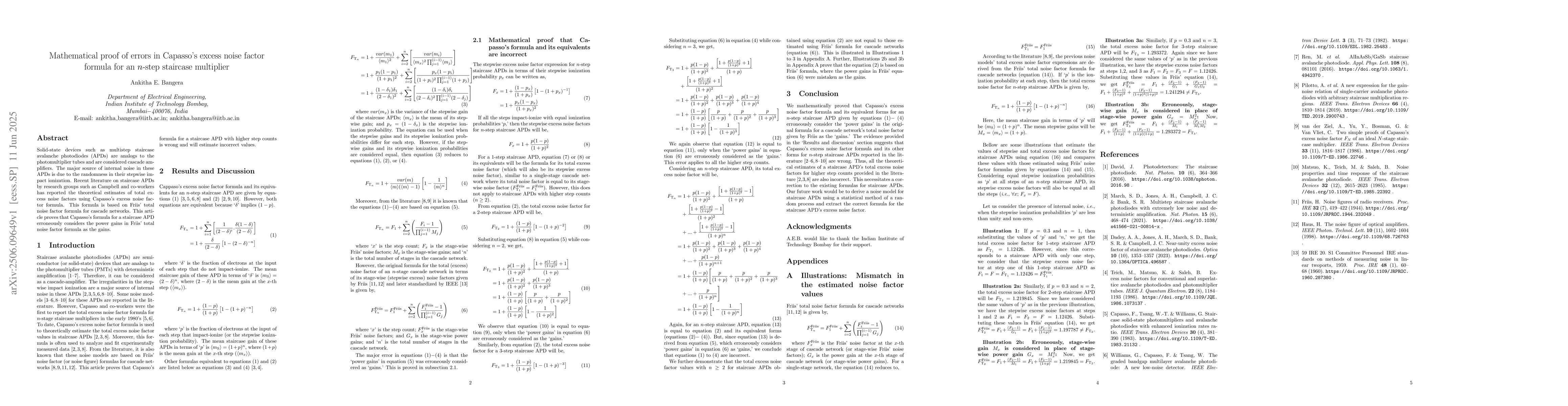 This paper presents a mathematical proof refuting Capasso's formula for calculating excess noise factors in n-step staircase multipliers. The error arises from misinterpreting power gains as simple gains in the Friis total noise factor formula, impacting theoretical estimates of noise in staircase APDs.