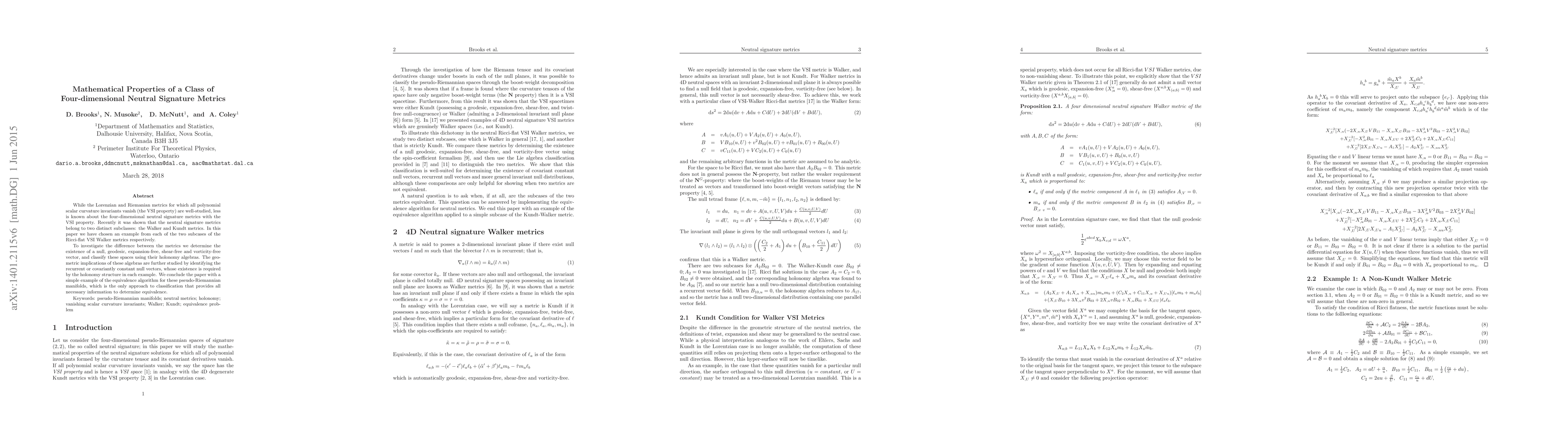 While the Lorenzian and Riemanian metrics for which all polynomial scalar curvature invariants vanish (the VSI property) are well-studied, less is known about the four-dimensional neutral signature metrics with the VSI property. Recently it was shown that the neutral signature metrics belong to two distinct subclasses: the Walker and Kundt metrics. In this paper we have chosen an example from each of the two subcases of the Ricci-flat VSI Walker metrics respectively. To investigate the difference between the metrics we determine the existence of a null, geodesic, expansion-free, shear-free and vorticity-free vector, and classify these spaces using their infinitesimal holonomy algebras. The geometric implications of the holonomy algebras are further studied by identifying the recurrent or covariantly constant null vectors, whose existence is required by the holonomy structure in each example. We conclude the paper with a simple example of the equivalence algorithm for these pseudo-Riemannian manifolds, which is the only approach to classification that provides all necessary information to determine equivalence.