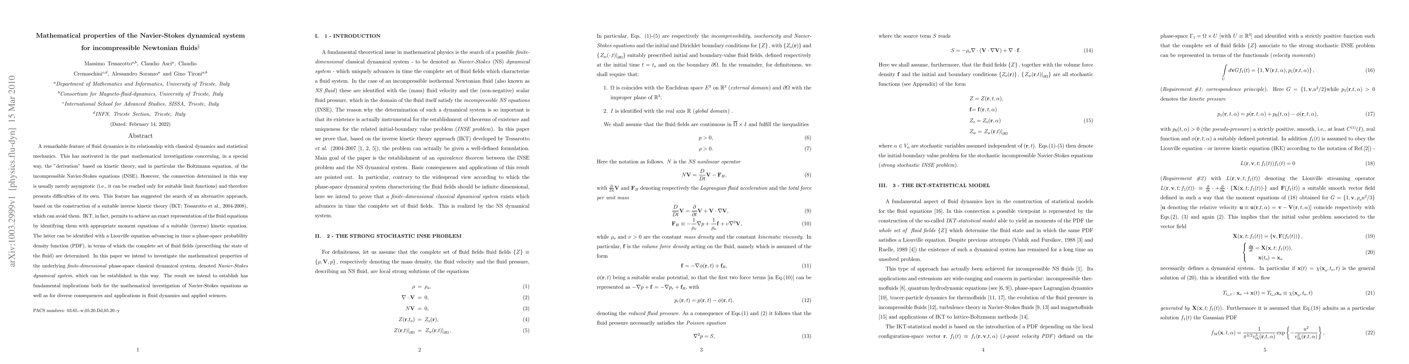 A remarkable feature of fluid dynamics is its relationship with classical dynamics and statistical mechanics. This has motivated in the past mathematical investigations concerning, in a special way, the "derivation" based on kinetic theory, and in particular the Boltzmann equation, of the incompressible Navier-Stokes equations (INSE). However, the connection determined in this way is usually merely asymptotic (i.e., it can be reached only for suitable limit functions) and therefore presents difficulties of its own. This feature has suggested the search of an alternative approach, based on the construction of a suitable inverse kinetic theory (IKT; Tessarotto et al., 2004-2007), which can avoid them. IKT, in fact, permits to achieve an exact representation of the fluid equations by identifying them with appropriate moment equations of a suitable (inverse) kinetic equation. The latter can be identified with a Liouville equation advancing in time a phase-space probability density function (PDF), in terms of which the complete set of fluid fields (prescribing the state of the fluid) are determined. In this paper we intend to investigate the mathematical properties of the underlying \textit{finite-dimensional} phase-space classical dynamical system, denoted \textit{Navier-Stokes dynamical system}, which can be established in this way. The result we intend to establish has fundamental implications both for the mathematical investigation of Navier-Stokes equations as well as for diverse consequences and applications in fluid dynamics and applied sciences.