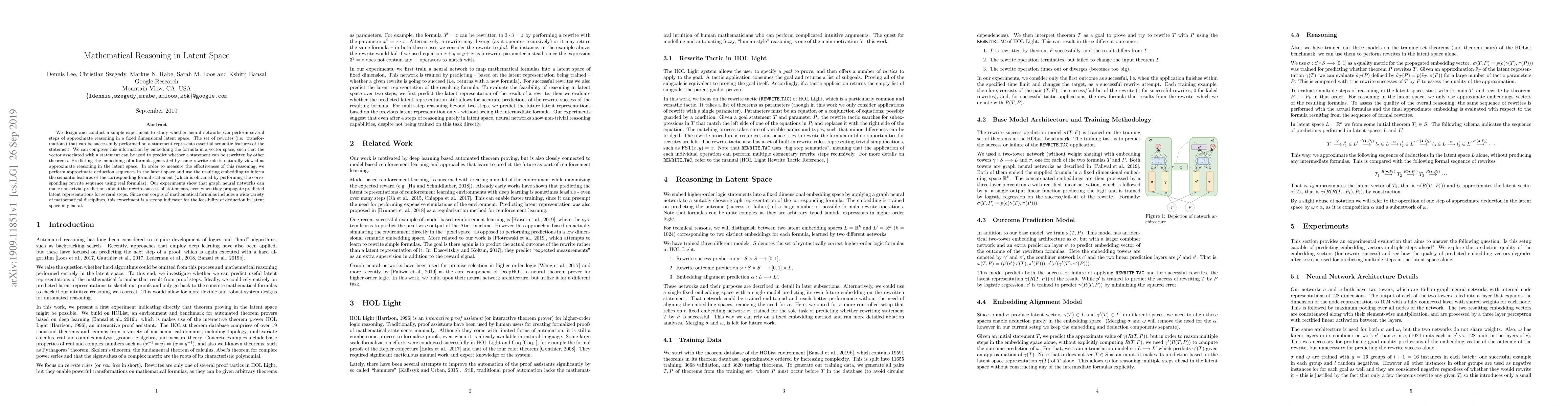 This research explores if neural networks can perform multi-step reasoning in a low-dimensional space. The study embeds mathematical statements into a vector space, using graph neural networks to predict rewrite success. Results indicate that these networks can make accurate predictions even after several steps, suggesting the potential for general deduction in latent space across various mathematical disciplines.