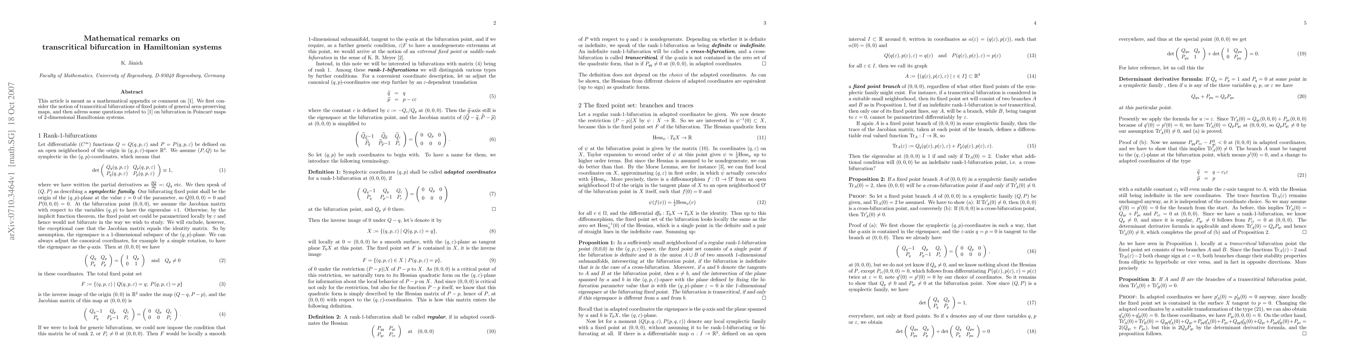 This article is meant as a mathematical appendix or comment on [BT]. We first consider the notion of transcritical bifurcations of fixed points of general area-preserving maps, and then adress some questions related to [BT] on bifurcation in Poincar\'e maps of 2-dimensional Hamiltonian systems. [BT] M. Brack and K. Tanaka, arXiv:0705.0753