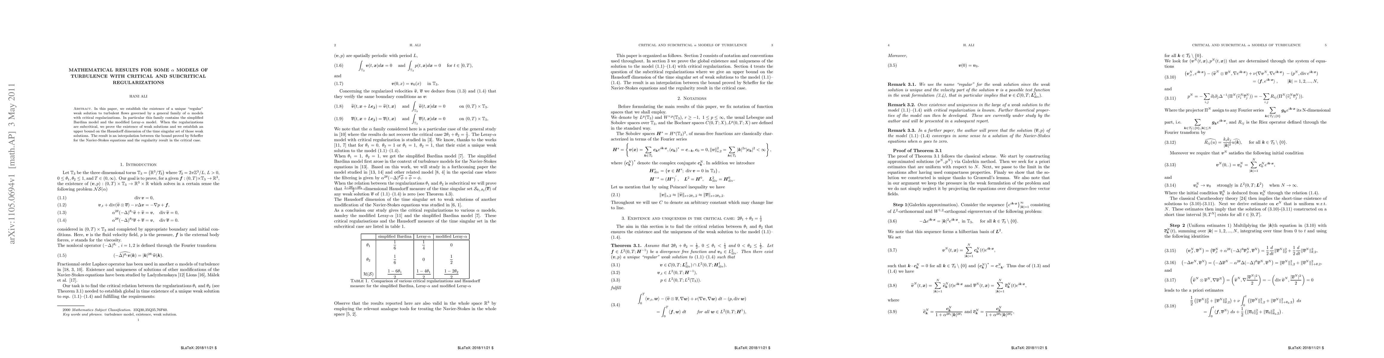 In this paper, we establish the existence of a unique "regular" weak solution to turbulent flows governed by a general family of $\alpha$ models with critical regularizations. In particular this family contains the simplified Bardina model and the modified Leray-$\alpha$ model. When the regularizations are subcritical, we prove the existence of weak solutions and we establish an upper bound on the Hausdorff dimension of the time singular set of those weak solutions. The result is an interpolation between the bound proved by Scheffer for the Navier-Stokes equations and the regularity result in the critical case.